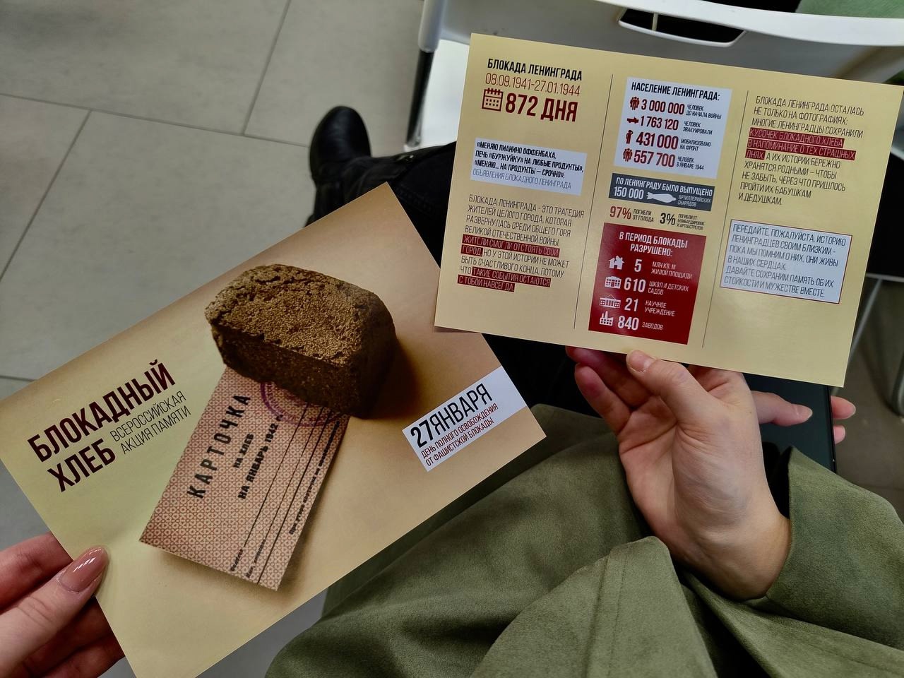 Руководитель Ивановского городского отделения «Волонтёры Победы» Алёна Титова провела акцию «Блокадный хлеб», ключевым символом которой является кусочек хлеба весом в 125 граммов — именно такая минимальная норма выдачи хлеба на человека в день была установлена в самый тяжелый период блокады.