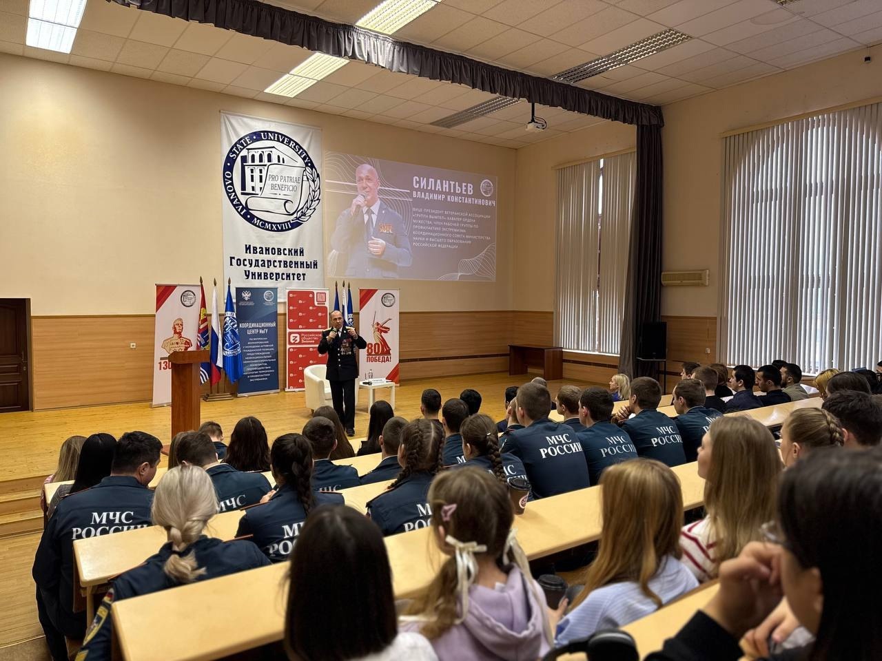 12 марта в актовом зале ИвГУ прошла значимая встреча с Владимиром Константиновичем Силантьевым — участником спецоперации по освобождению заложников в Беслане, кавалером ордена Мужества, ветераном Управления "В" Центра специального назначения ФСБ России, первым вице-президентом Ассоциации "Группы "Вымпел" и полковником запаса. Важность этого события подчеркнуло присутствие представителей других университетов Иваново и области, таких как ИГЭУ имени В.И.Ленина, ИПСА ГПС МЧС России, Ивановский ГМУ и Верхневолжский ГАУ.