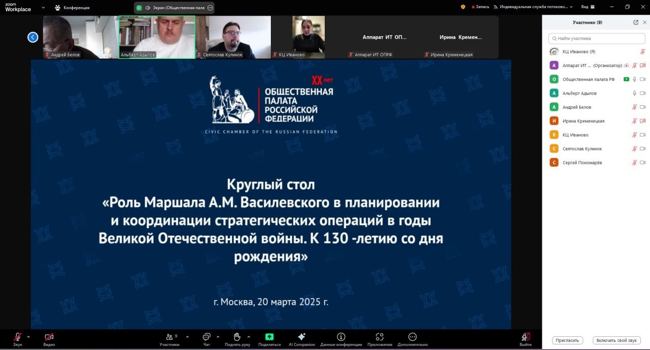20 марта в Общественной палате РФ состоялся круглый стол «Роль Маршала А.М. Василевского в планировании и координации стратегических операций в годы Великой Отечественной войны. К 130-летию со дня рождения», к которому присоединился и Координационный центр ИвГУ.
