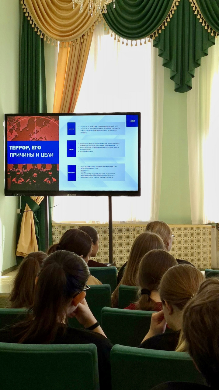 В ходе мероприятия Нина Валентиновна подробно осветила понятие «террор», его причины, цели и исторические аспекты распространения террористической деятельности. Особое внимание было уделено ценностно-смысловым основам права в контексте противодействия идеологии терроризма, среди которых: должное; свобода; формальное равенство; уважение права другого; принятие разного; признание способности и возможности действовать во благо общества при реализации своих интересов.