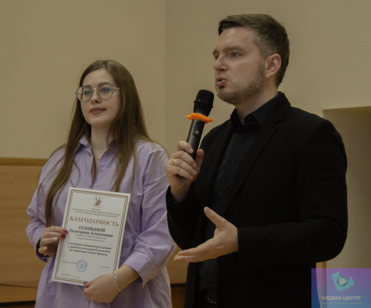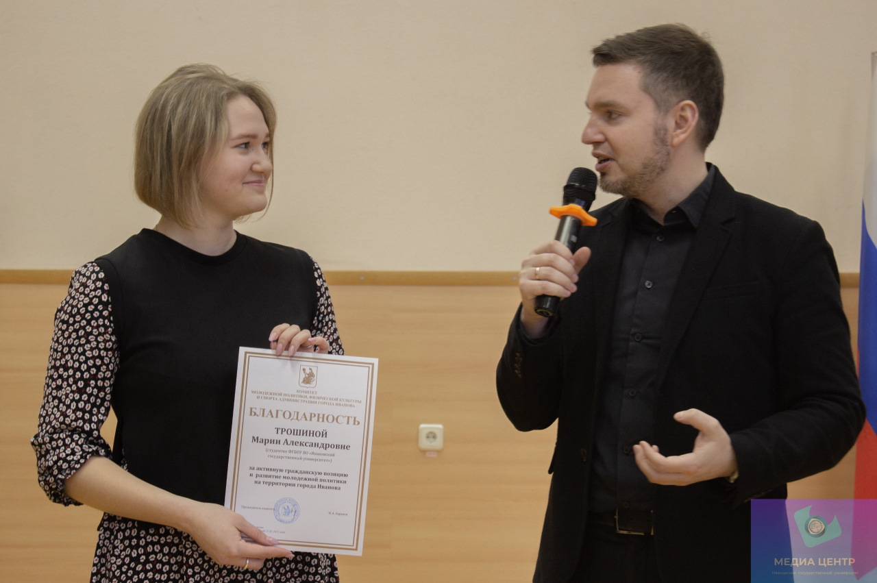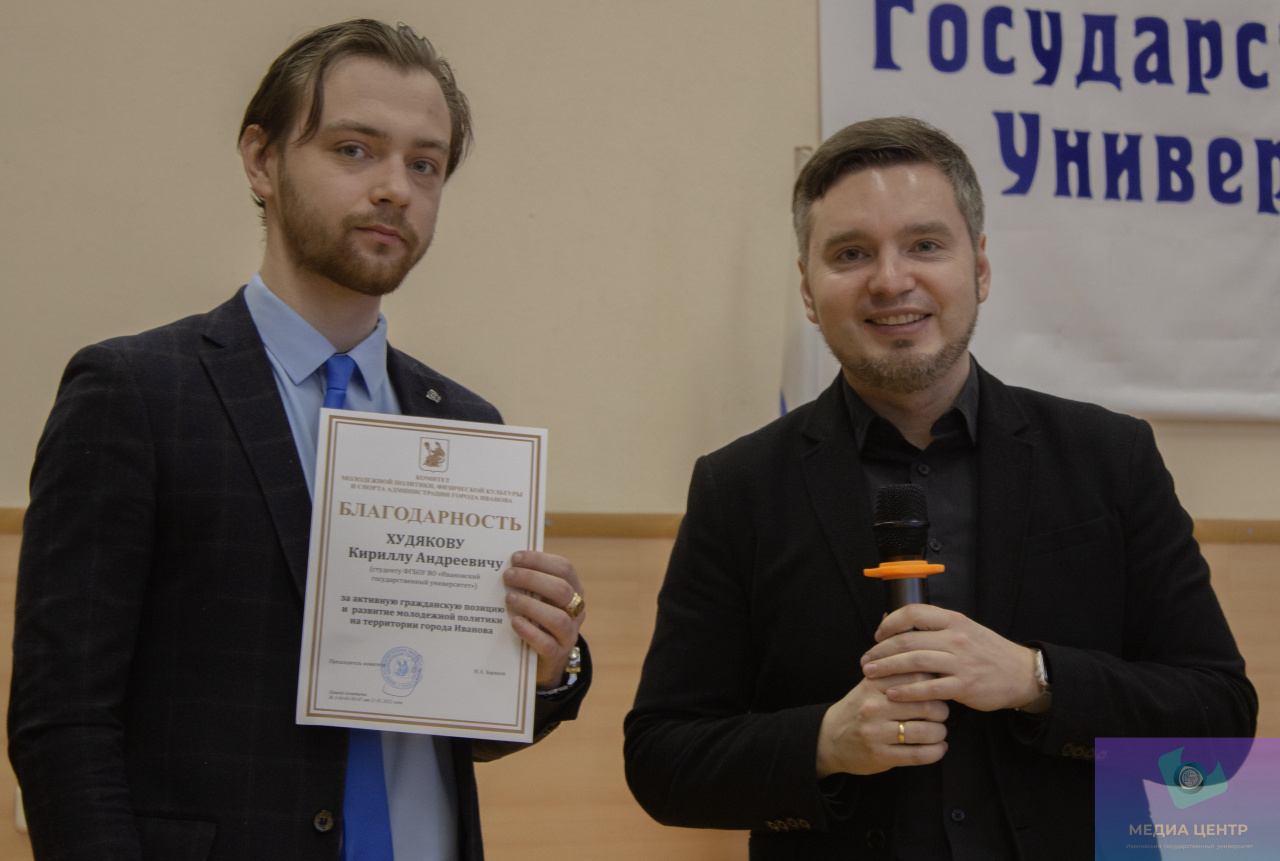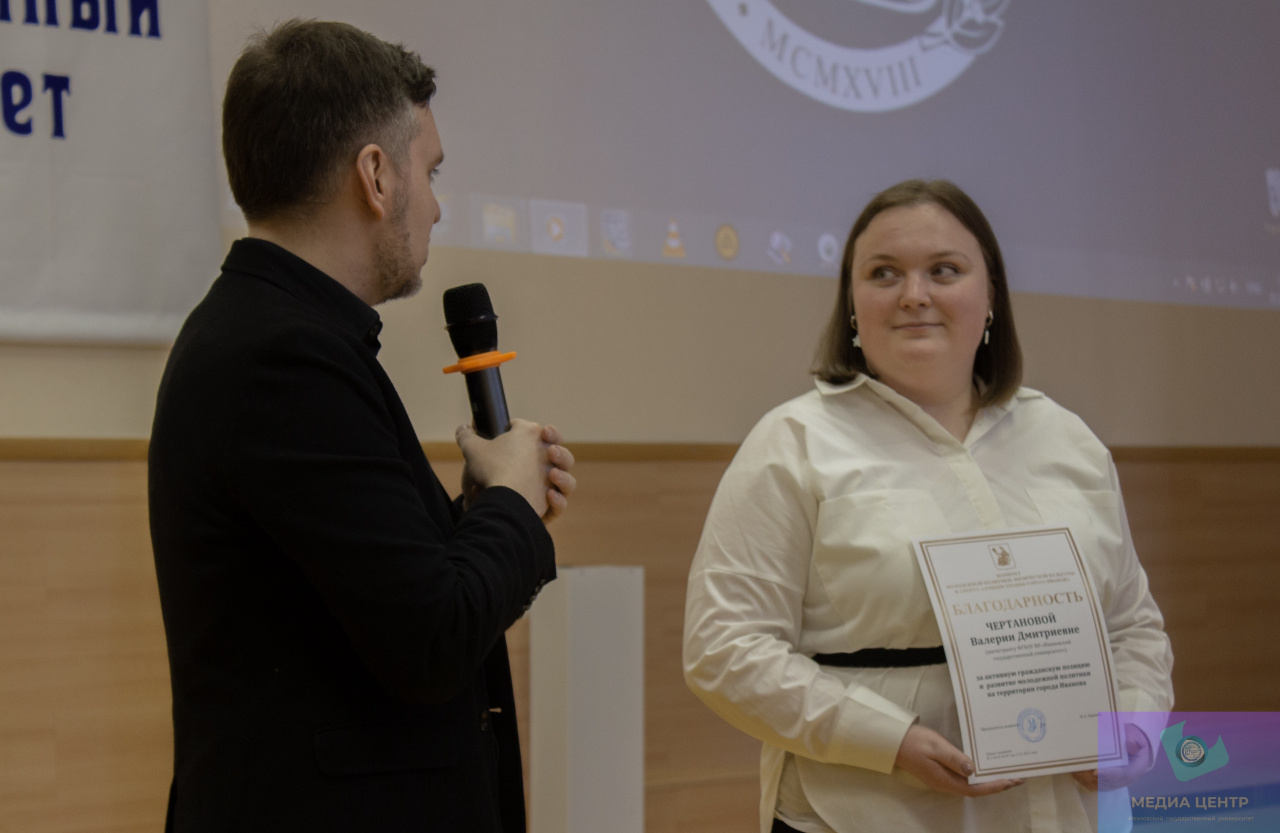 In the assembly hall, vice-rector for social development and international affairs Nikita D. Sorokin presented gratitude to the most active students from the Committee of Youth Policy, Physical Culture and Sports of Ivanovo City Administration. During the award ceremony, N. Sorokin warmly noted the merits and talent of everyone and wished them success in their future work.