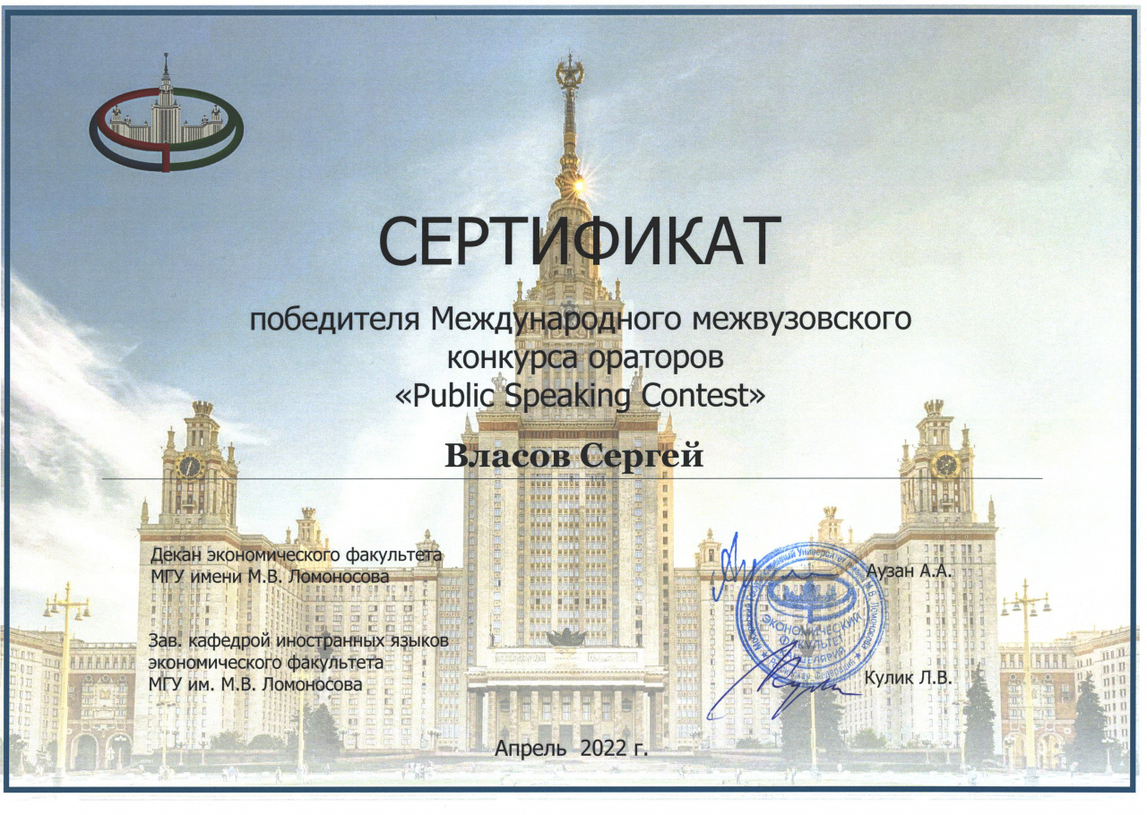 From February 28 to May 15, 2022 on the basis of the Faculty of Economics of Moscow State University. M.V. Lomonosov hosted the III International Public Speaking Contest in English. Our university was represented by Sergey Vlasov, a 2nd year student of the International Relations department of the Institute for the Humanities of IvSU.