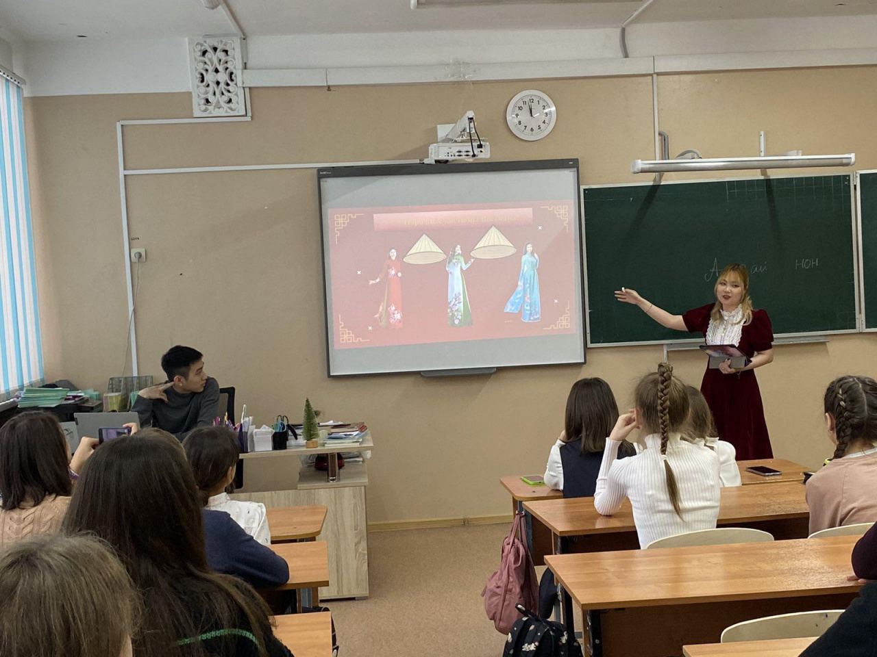 On a gloomy winter day on February 6, in one of the classes of the Ivanovo gymnasium No. 36, it was unusually festive, warm and light! Vietnamese students Nguyen Thuy Ly (2nd year of the Master's program in the educational program "Philology") and Hung Dinh Quoc (3th year of the bachelor's degree in the educational program "International Relations") under the guidance of Associate Professor of the Center for Russian Studies and International Education R.N. Kanafieva visited Russian schoolchildren to tell them about the traditions of celebrating the Lunar New Year – an exotic and magnificent event in a number of countries in Southeast Asia.