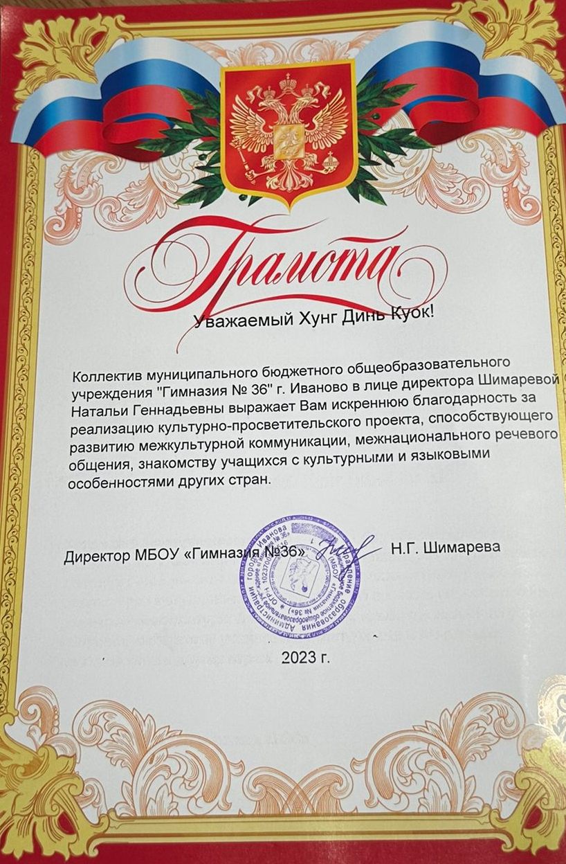 The meeting of our Vietnamese students and students of the gymnasium became a dialogue in Russian between representatives of such different folk cultures, brought a lot of positive emotions and, undoubtedly, stimulated interest in knowing the unknown in the world, as well as respect for the native culture and the culture of other peoples. On this day, the students acquired an extremely important experience and the most pleasant impressions from communicating with Russian schoolchildren. In parting, Li and Ding received gratitude from the director of the gymnasium for the implementation of a cultural and educational project that promotes the development of intercultural communication, interethnic speech communication, acquaintance of students with the cultural and linguistic characteristics of other countries, as well as memorable Russian souvenirs.