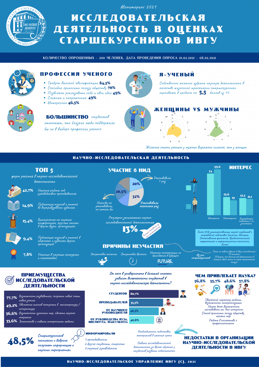 Thus, according to a survey conducted in February 2021 among IvSU undergraduates (n=200 people), the desire to build a career as a scientist is more often demonstrated by young men, and girls in this case are more likely to note self-doubt. At the same time, the profession of a scientist is perceived by students, on the one hand, as useful and interesting, and on the other hand, as quite complex and stressful. The results of the survey are presented in more detail in the infographic: