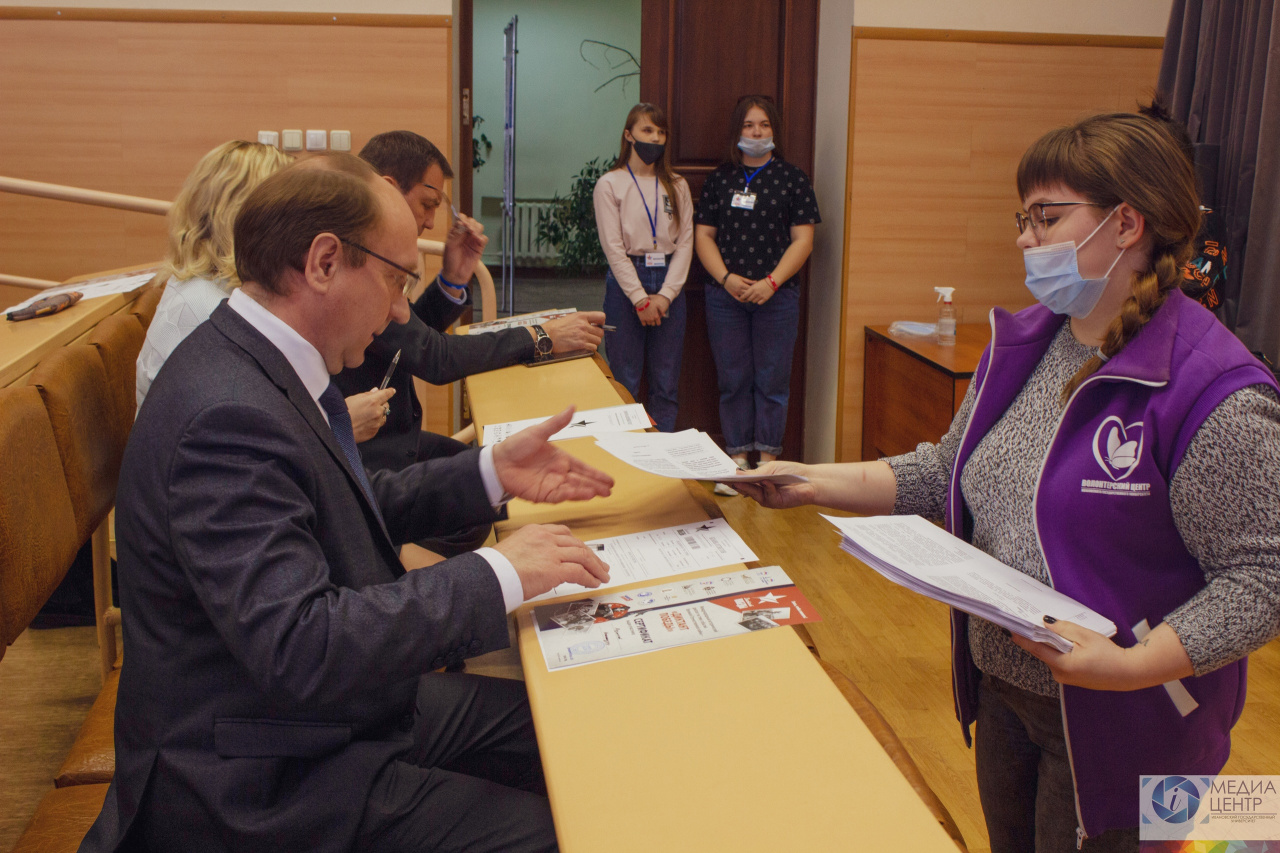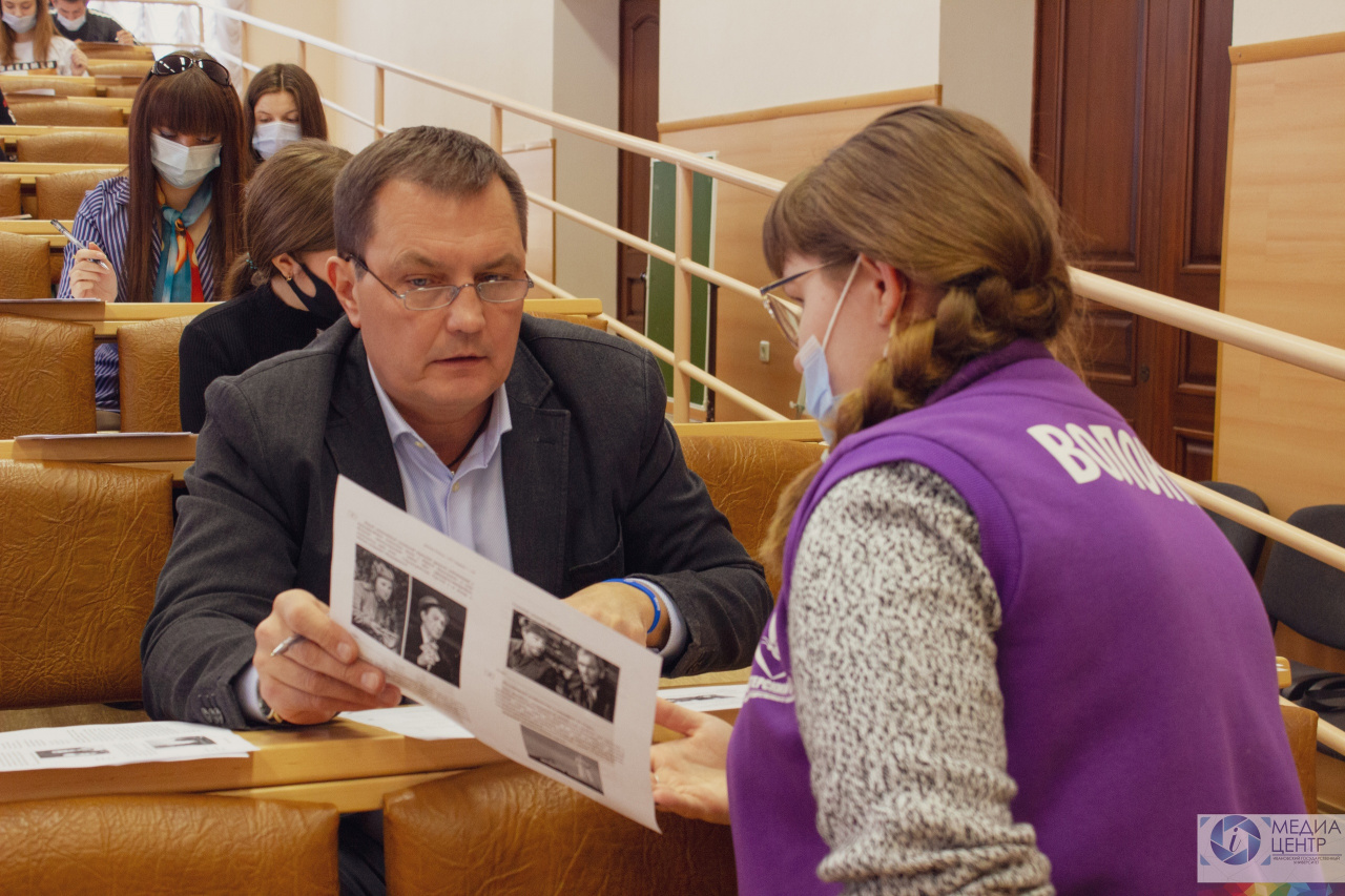 The chairman of Ivanovo city council Aleksandr Kuzmichyov joined IvSU to write the Dictation. In his welcoming speech he underlined how important it is to remember the feats of our heroes. That is why the stela “The city of larour merits” is going to be installed at the entrance to the city. Ivanovo got this title in 2020.