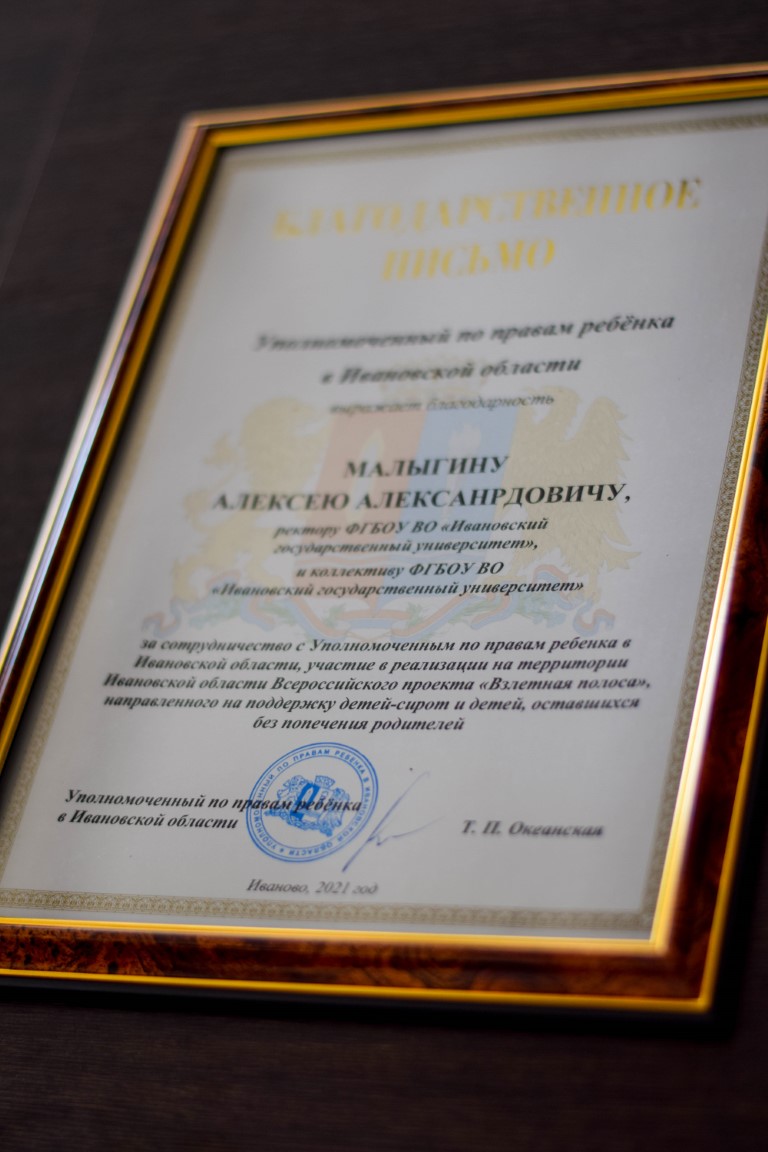 The first Letter of Gratitude was presented to the rector of IvSU Aleksey Malygin for cooperation with Children's Rights Ombudsman and participation in the organization of the All-Russian project “Runway” in Ivanovo Region. Tatyana Okeanskaya noted that IvSU and the Ombudsman Institute are linked by long-term cooperation. In response, the vice-rector of IvSU Nikita Sorokin conveyed the words of regret from Alexey Malygin about the impossibility of his personal presence at the event, as well as the following: “At the university we value friendship, cooperation, partnership with the Ombudsman Institute and personally with you, dear Tatyana. Thanks to your efforts, our region is distinguished by a very strong, very adult, very professional Ombudsman Institute".