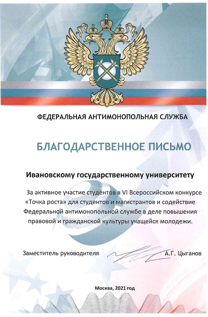 IvSU received a Letter of Gratitude for the active participation of students in the VI All-Russian competition "Point of Growth", as well as for the assistance to the Russian FAS in improving the legal and civil culture of students.