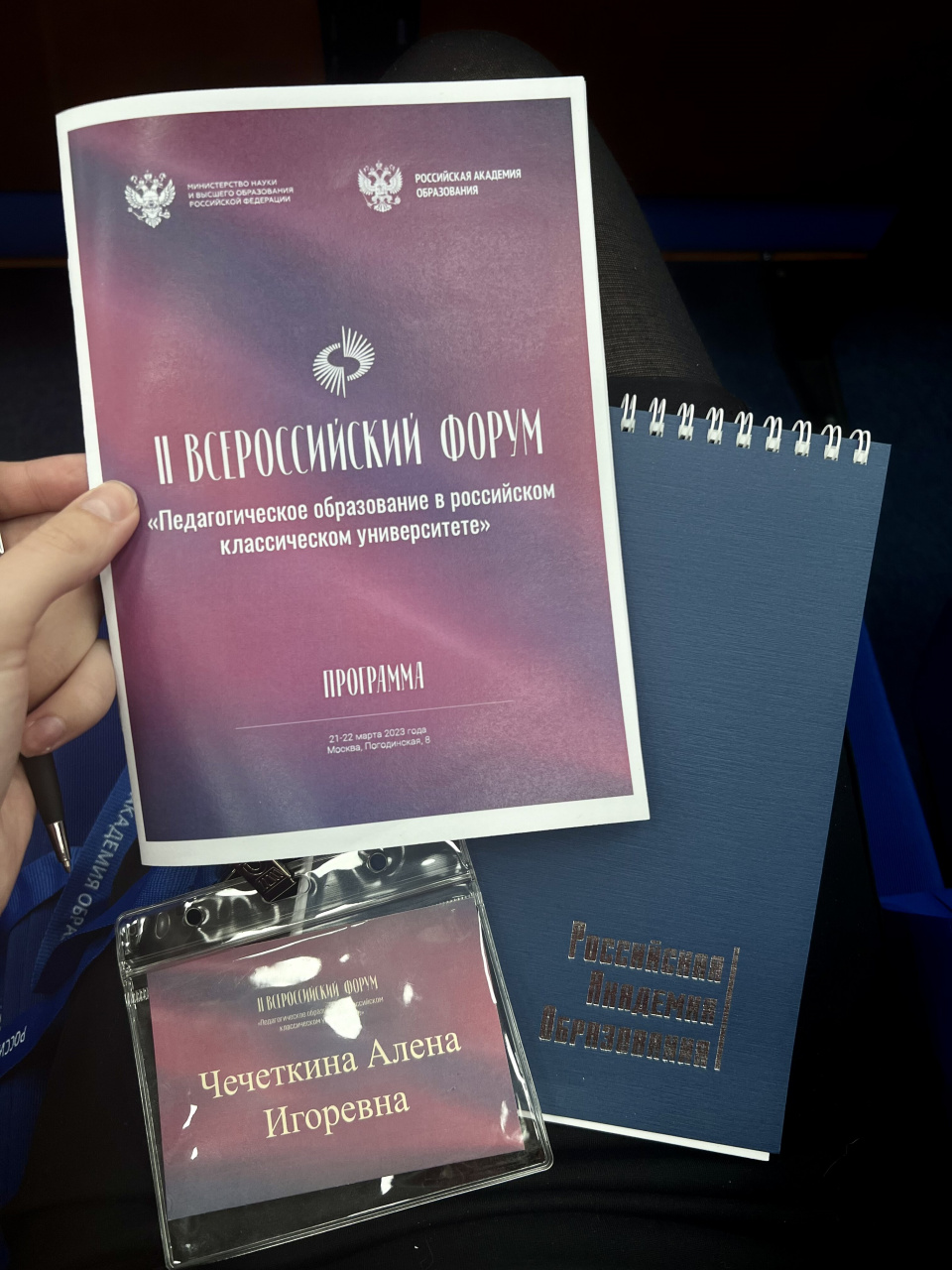 21–22 марта 2023 года в Москве проходил II Всероссийский форум «Педагогическое образование в российском классическом университете», в котором приняли участие наши молодые ученые: аспирант 1-го курса кафедры НППО Строготяну Арина Леонидовна и аспирант 2-го курса кафедры НППО и преподаватель кафедры зарубежной филологии Чечеткина Алёна Игоревна.