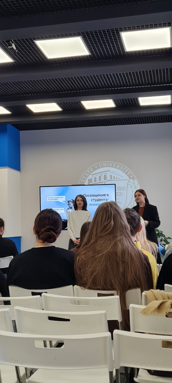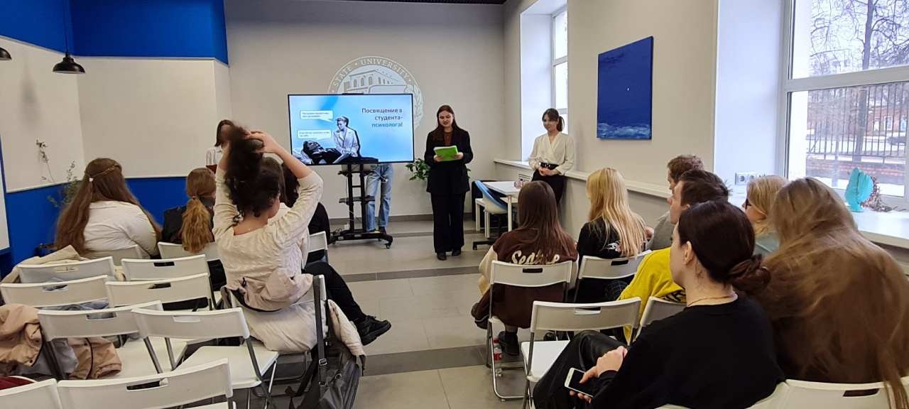 Сегодня студентки 3-го курса Оля Курлапова, Полина Киселева, Светлана Пуговкина, Елена Рыжова под руководством куратора первого курса, доцента кафедры Елены Игоревны Сушковой официально приняли первокурсников в психологи.