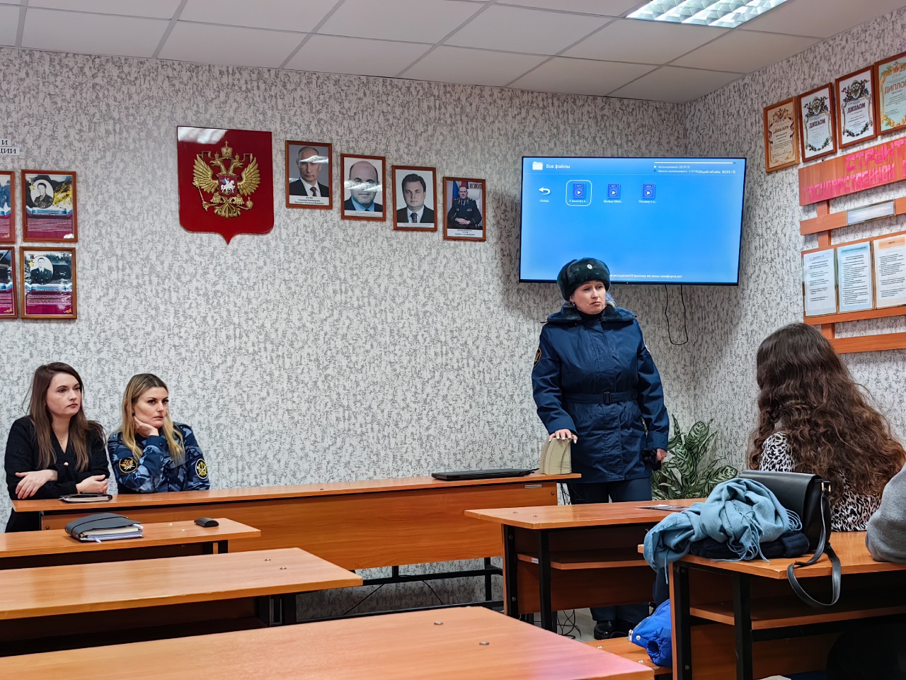 Экскурсия началась в учебной комнате, где перед студентами выступили начальник психологической лаборатории Кладова Анна Анатольевна, старший психолог психологической службы УФСИН Шакурова Наталья Николаевна, заместитель начальника учреждения по кадровой и воспитательной работе Днепровская Наталья Владимировна, старший психолог Субботина Галина Николаевна, начальник отдела кадров Докучаева Елена Валерьевна.