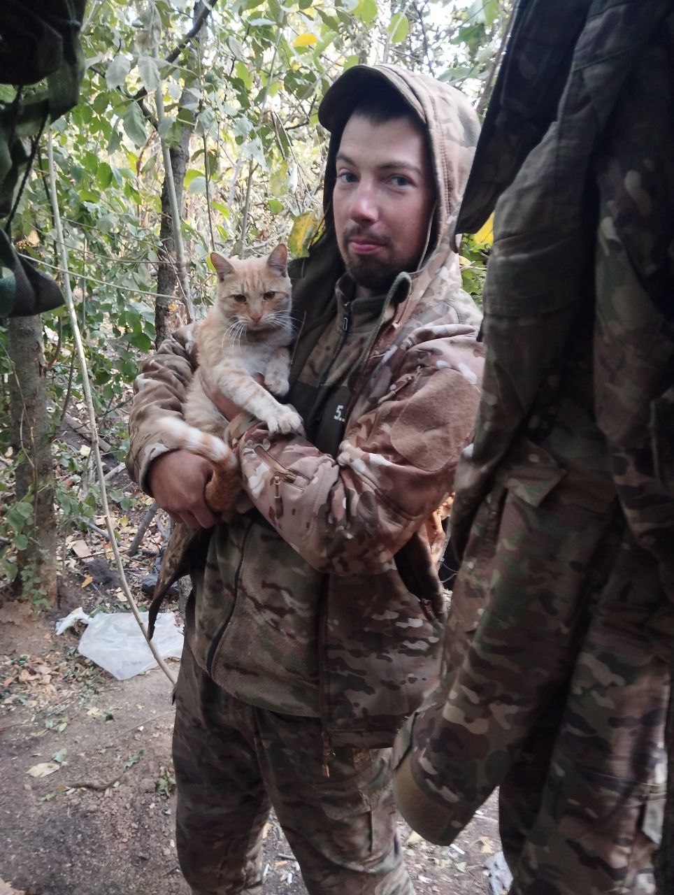 Посмотрите, какие фотографии он присылал родителям с фронта: в военной форме, с автоматом, но держит кошечку, гладит собачку! Словно говорит: «Мама, все хорошо. Я забочусь о братьях наших меньших, поэтому - не волнуйся!». Забота о других - важная черта солдата с позывным «Учитель».