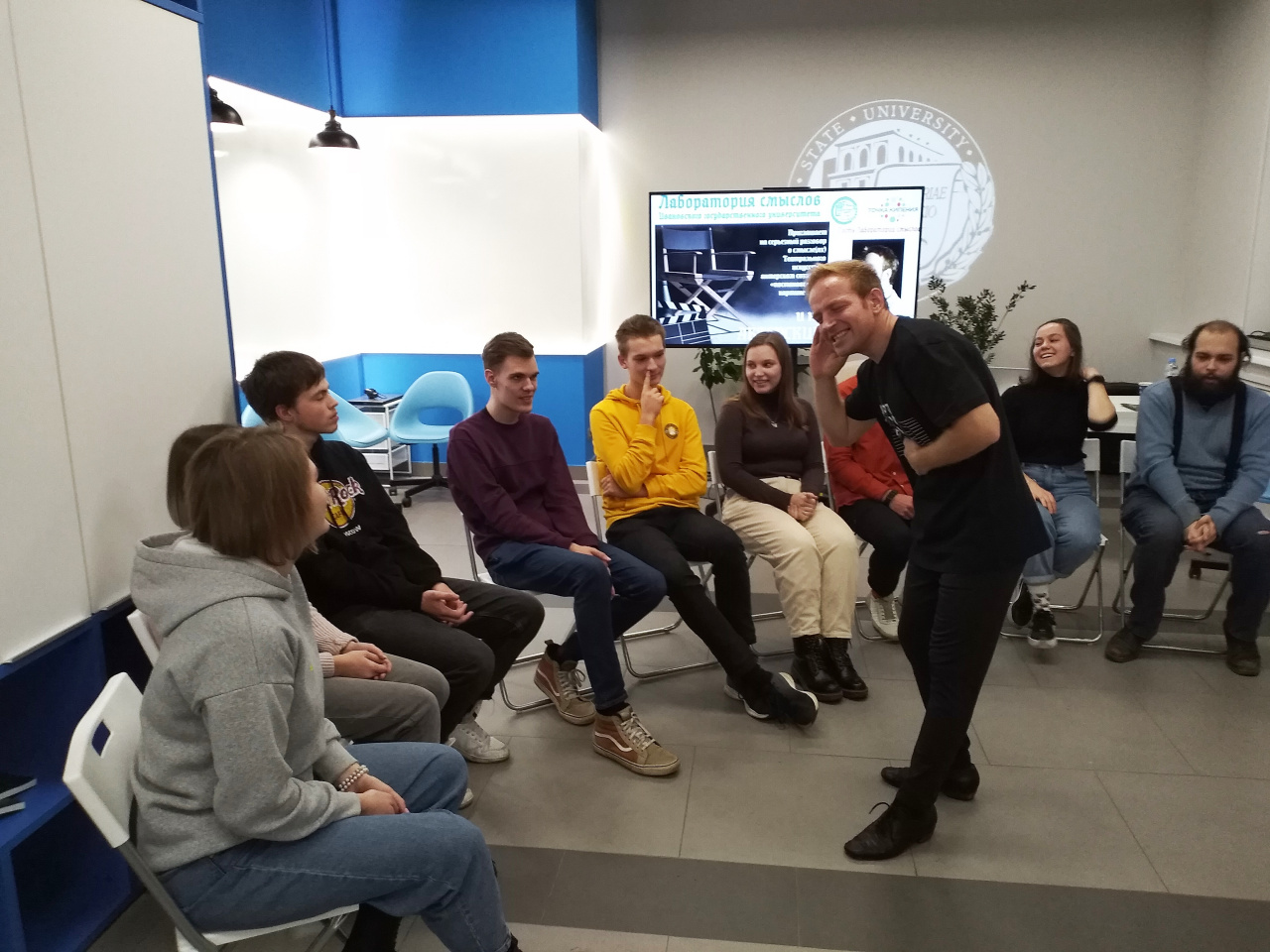 «Актерский интенсив», в котором приняли участие студенты – историки, химики, социологи – включал разнообразные по форме и уровню сложности «тренировочные» задания. Участники научились тренировать память и многозадачность, «манипулировать» сознанием и поведением «оппонента», вживаться в различные социальные роли и семиотические ситуации. Особенно сложными оказались «невербальные» театральные задачки, где требовалось разрешить поставленную Мастером проблему без обращения к речи.