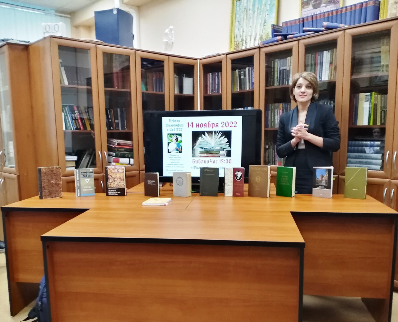 «Философский ноябрь» в ИвГУ начался 14 ноября, когда стартовала Неделя философии. Мери Меликян – хранитель кабинета гуманитарных наук имени профессора Н.П. Антонова – провела для студентов БиблиоЧас, в рамках которого начинающие мыслители попытались разобраться в философических хитросплетениях текстов Конфуция, Платона, Кондорсе, Вольтера, Ламметри, Шопенгауэра, Л.Н. Толстого, П.А. Сорокина, Х. Ортеги-и-Гассета, Н.А. Бердяева, Д.С. Лихачева.