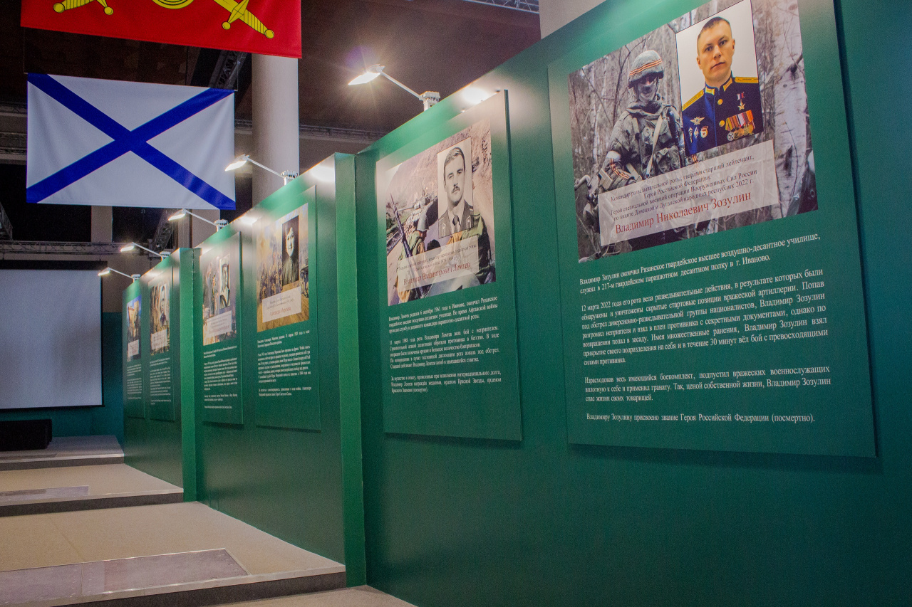 Выставка включает аудиовизуальную инсталляцию – исторический экскурс от победы Александра Невского до современности. От событий Смутного времени (рубеж XVI–XVII вв.) и до специальной военной операции российской армии – у каждого времени были свои герои: воевода Федор Боборыкин, разведчица Александра Морозова, старший лейтенант Владимир Ломтев, младший сержант Юрий Смирнов и другие. Завершает экспозицию подвиг Героя России, старшего лейтенанта Владимира Зозулина, пожертвовавшего собой ради спасения товарищей.