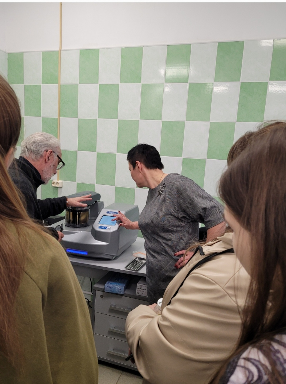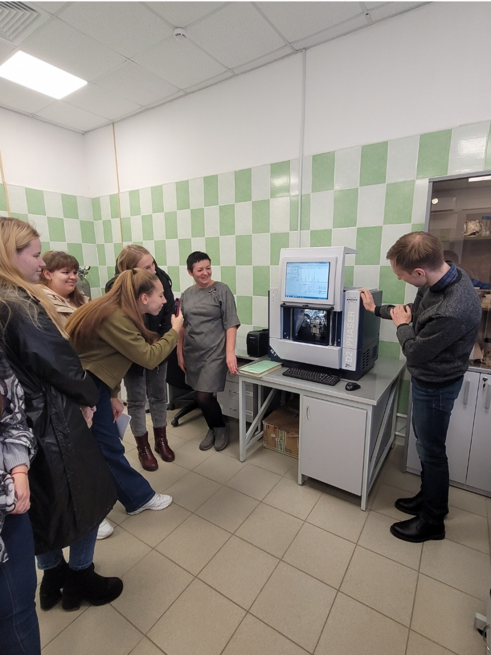 Ребята увидели рентгеновский дифрактометр D2 PHASER, предназначенный для решения большинства задач порошковой рентгенографии: качественного и количественного фазового анализа, определения параметров элементарной ячейки, размеров кристаллитов, степени кристалличности, напряжений в кристаллической решетке.