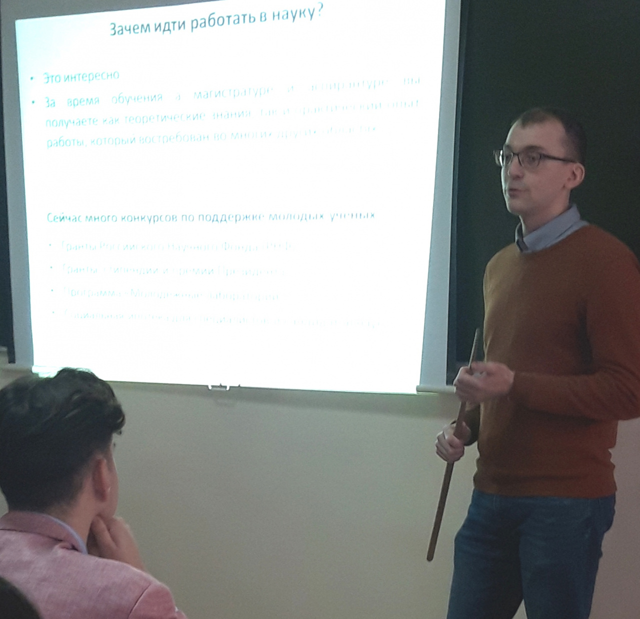 Александр Юрьевич – молодой ученый, выпускник кафедры общей биологии и физиологии ИвГУ 2010 г., успешно работает в этой организации. Он наглядно рассказал студентам о современных исследованиях в области биологии и медицины, проводимых в лабораториях ФНЦ, о значимых научных проектах и достижениях, перспективах и международных связях. Он подчеркнул возможности студентов кафедры проходить практики и выполнять ВКР на базе лабораторий ФНЦ. Он рассказал о своем пути в науку, поделился опытом, сложностями и успехами.