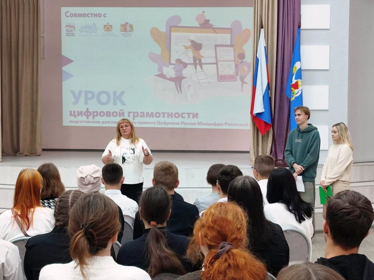 В рамках проекта «Цифровая Россия» прошел урок цифровой грамотности для школьников 7–11 классов. Акция охватила образовательные учреждения 36 регионов России. Для проведения уроков в МБОУ «Средняя школа № 14» и «Средняя школа № 41» были привлечены цифровые волонтеры ИвГУ, а именно студенты 2-го курса направления подготовки 09.03.03 Прикладная информатика Рябцева Анастасия, Котова Мария, Гусарова Ксения и Баринов Максим.