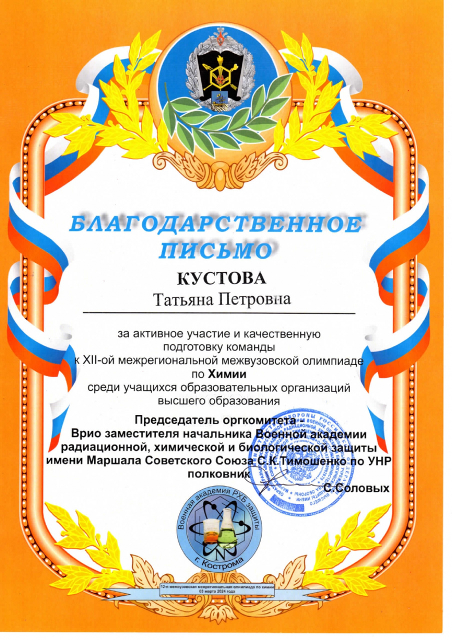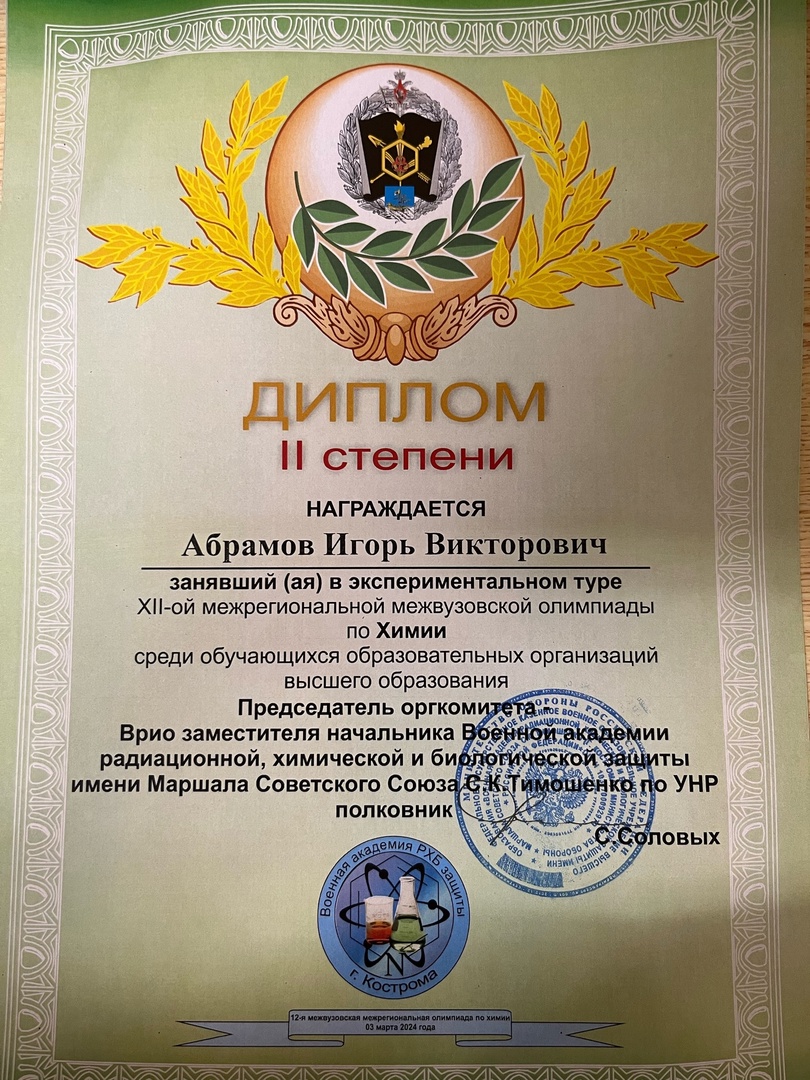 3 марта в Костроме на базе Военной академии радиационной, химической и биологической защиты им. Маршала С.К. Тимошенко прошла XII Межрегиональная межвузовская олимпиада по химии. В ней приняли участие более 70 студентов в составе 15 команд из ведущих вузов Санкт-Петербурга (Военно-медицинская академия им. С.М. Кирова, Российский государственный педагогический университет им. А.И. Герцена), Москвы (РХТУ им. Д.И. Менделеева), Ярославля (ЯрГТУ и ЯрГПУ им. К.Д. Ушинского), Костромы (КГУ и КГСХА), Кирова (Кировский государственный медицинский университет) и Иванова (ИвГУ, ИГХТУ и ИПСА ГПС МЧС России). Команда химиков ИвГУ в составе: Абрамова Игоря, Зарубина Антона, Семеновой Полины, Сальковой Александры и Шилимановой Анны достойно представила родной вуз и в упорной борьбе с сильными соперниками выиграла 2-е место в самом престижном – экспериментальном – туре олимпиады. Команда ИвГУ участвовала в костромской олимпиаде уже в десятый раз, но выше 4-го места раньше не поднималась. Тем приятнее было получить такую высокую награду.