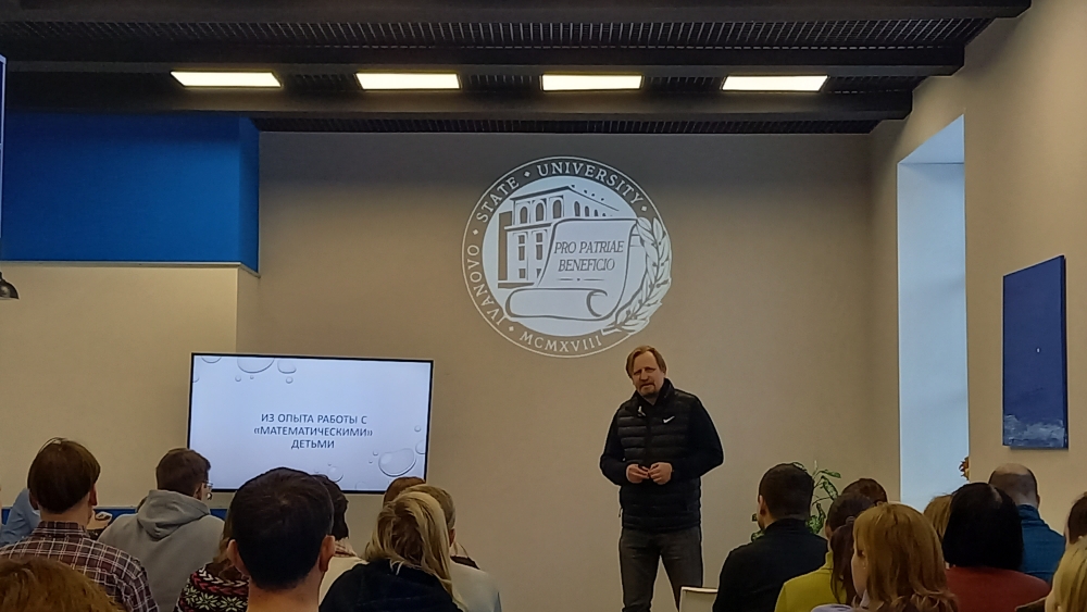 В рамках математического турнира для учителей математики и для родителей, которые интересуются математикой, в «Точке кипения – ИвГУ» состоялась открытая лекция «Из опыта работы с «математическими» детьми». Лектор – Власов Евгений Викторович, кандидат физико-математических наук, доцент кафедры фундаментальной математики ИвГУ, директор ЧОУ «Гармония», педагог дополнительного образования «Центра развития детской одаренности», работает в системе образования уже более 30 лет, став наставником для многих одаренных ребят.