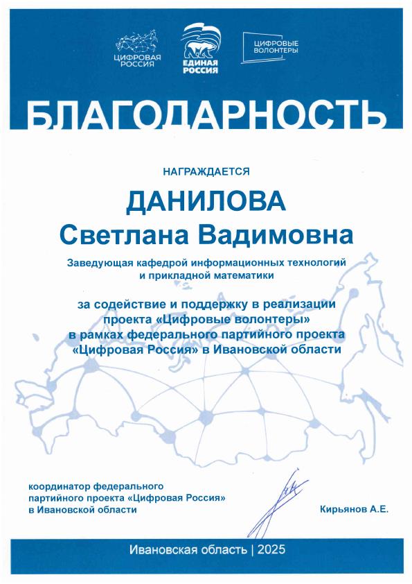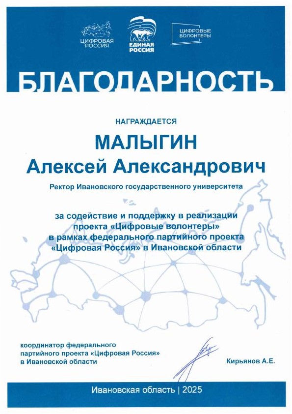 Ректору ИвГУ А.А. Малыгину и преподавателям кафедры информационных технологий и прикладной математики от имени координатора проекта «Цифровая Россия» А.Е. Кирьянова были направлены благодарности за содействие и поддержку в реализации проекта «Цифровые волонтеры» в рамках федерального проекта «Цифровая Россия» в Ивановской области.