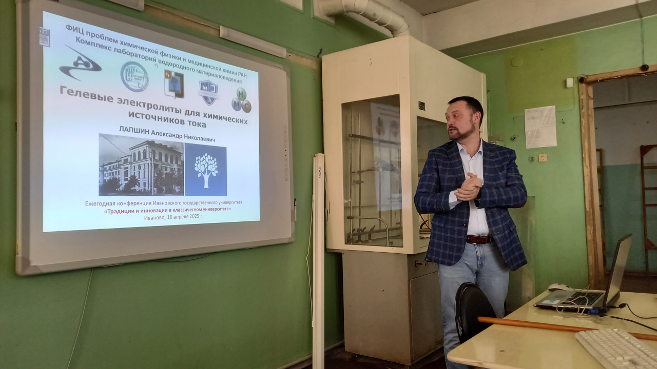 16 и 17 апреля в рамках научного фестиваля ИвГУ прошло заседание секции «Фундаментальные и прикладные исследования в области химии: взаимная связь научных школ, традиции и инновации». Традиционно программу мероприятий открыли лекции ведущих ученых Федерального исследовательского центра проблем химической физики и медицинской химии РАН из г. Черноголовки. С этим научным центром у нашего университета давние дружеские связи в рамках НОЦ «Химическая физика» (руководитель – проф. М.В. Клюев). На этот раз к нам приехали канд. хим. наук, старший научный сотрудник, зав. лабораторией металлогидридных источников тока Володин А.А. и канд. хим. наук, научный сотрудник Лапшин А.Н. Их лекции были посвящены проблемам и перспективам водородной энергетики: металлогидридным системам хранения и преобразования энергии и гелевым электролитам для химических источников тока.