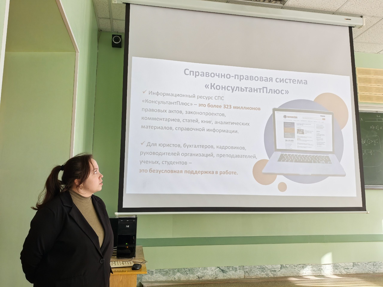 На встрече гости наглядно продемонстрировали, как мощный инструмент — справочно-правовая система «КонсультантПлюс» — может стать надежным помощником в разных сферах жизни: в учебе - для подготовки рефератов, курсовых работ, решения задач по правовым дисциплинам и не только; в повседневной жизни - для поиска актуальной информации по самым разным вопросам — от жилищного права до защиты прав потребителей. Во время рассказа студентам было предложено проверить свою внимательность и найти первым на презентации котика и получить памятный приз.