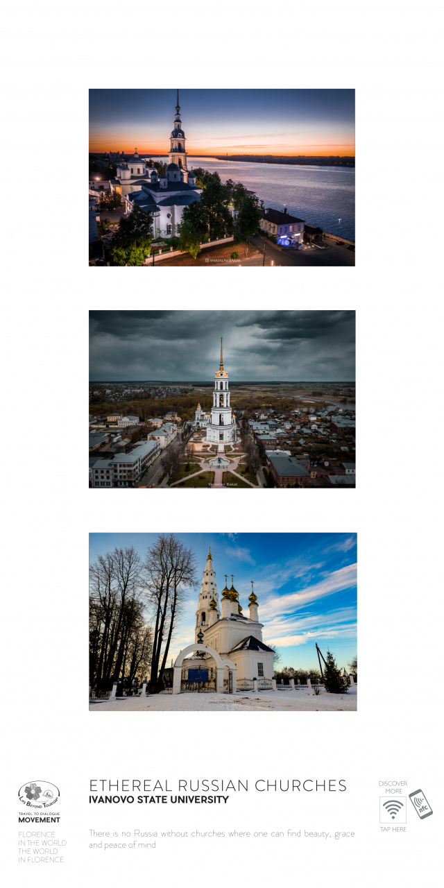 Для международной интерактивной фотовыставки во Флоренции команда ИвГУ (студенты Д. Демидова, А. Соколова, А. Низова, А. Гусева, научные руководители доц. Е.А. Шилова и доц. Е.М. Григорьева, художественные руководители (предоставление фотоматериалов) доц. Д.С. Докучаев и преп. А.В. Леонов) подготовила постеры с цветными иллюстрациями и подробной культурологической справкой по нескольким темам: «Православные жемчужины Ивановской области», «Народные художественные промыслы Палеха», «Конструктивизм в архитектуре Иванова» – и др. Постеры снабжены специальным NFC-кодом, который считывается смартфоном или любым другим «умным» гаджетом и позволяет моментально получить ссылку на специальный раздел фестивального сайта, посвященный Центральной России и, в частности, Ивановской области.