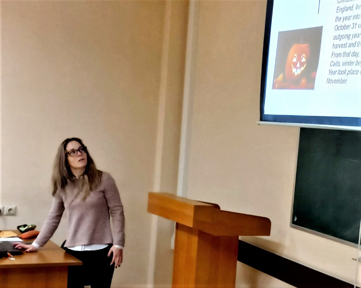 1 декабря 2022 г. кафедра зарубежной филологии ИвГУ принимала учителя английского языка, руководителя методического объединения учителей иностранных языков гимназии № 23 Е.Ю. Волкову. Студенты 4-го курса направления «Филология (Зарубежная филология)» участвовали в семинаре на тему «Инновационные технологии при обучении ИЯ как средство повышения качества образования». Елена Юрьевна рассказала о методических средствах, позволяющих повысить мотивацию и вовлеченность школьников в изучение английского языка: метод проектов, CLIL-технологии, ментальные карты, «облако слов», приложения Quizlet и Kahoot, геймификация.