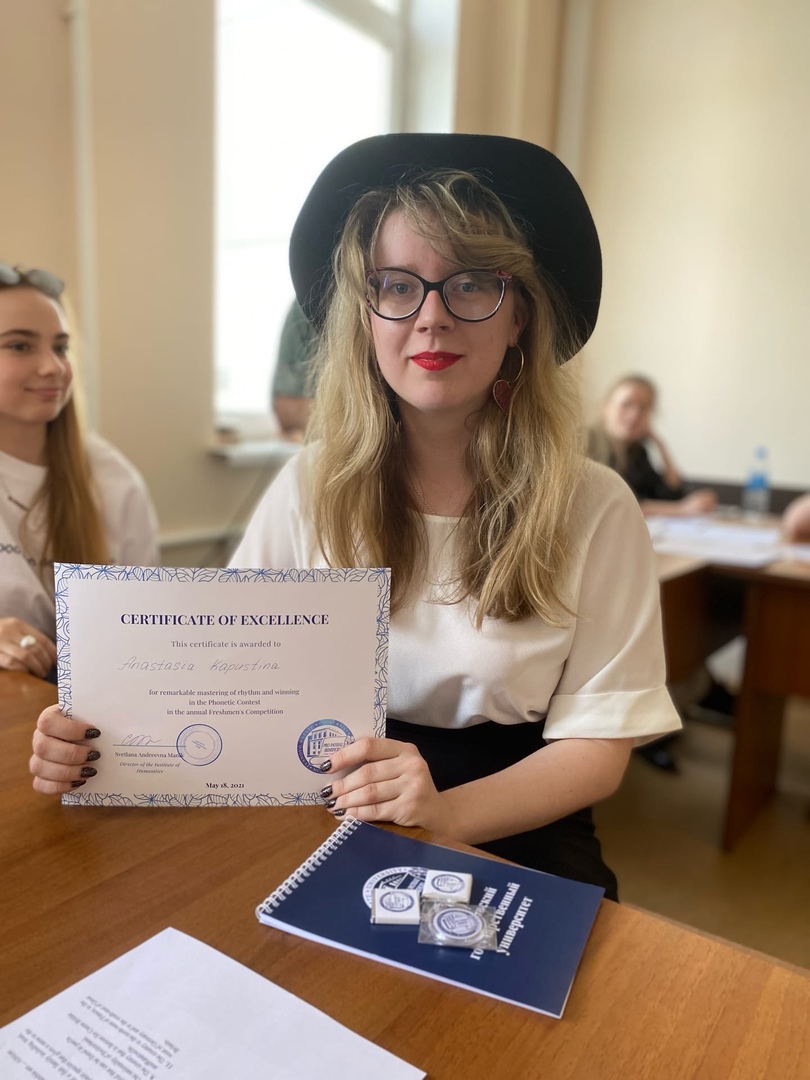 После вступительных слов первокурсники творчески представили свои группы, а затем продемонстрировали фонетические способности в конкурсе чтения скороговорок на английском языке под метроном в разном темпе и ритме. Победила в данной номинации среди педагогических групп Анастасия Капустина. Победителем фонетического конкурса среди студентов зарубежной филологии стала Дарья Борисова.