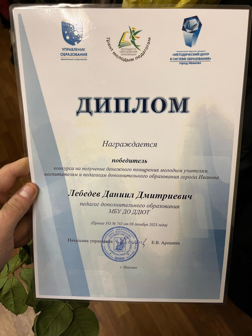 15 декабря на базе лицея № 33 состоялось вручение наград победителям Конкурса на поощрение лучших молодых педагогов, работников муниципальных общеобразовательных, дошкольных организаций и учреждений дополнительного образования в 2023 году. Победителем конкурса на получение денежного поощрения в номинации «Педагог дополнительного образования МБУ ДО ДДЮТ» стал студент 3-го курса направления подготовки «Спортивная тренировка в избранном виде спорта» Лебедев Даниил.