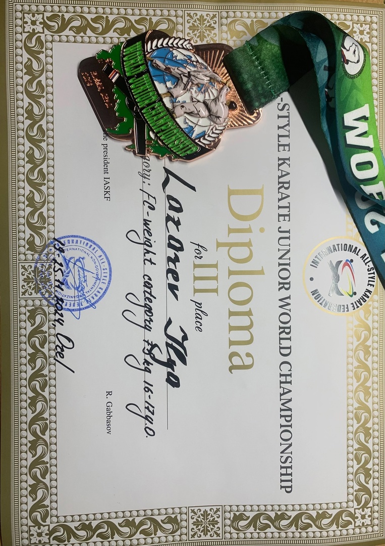 Студент 1 курса направления подготовки "Спортивная тренировка в избранном виде спорта" Илья Лазарев завоевал бронзовую медаль на Первенстве мира по всестилевому каратэ, которое прошло с 19 по 25 ноября в Орле. В нем приняли участие более 2000 спортсменов из 28 стран.