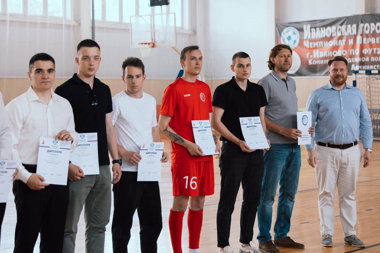 Ректор Алексей Александрович Малыгин вручил награды команде студентов по футзалу ИвГУ, которая завоевала первое место на Всероссийских соревнованиях «ФУТЗАЛ – В ВУЗЫ» сезона 2024-2025 в Серебряной лиге 1.