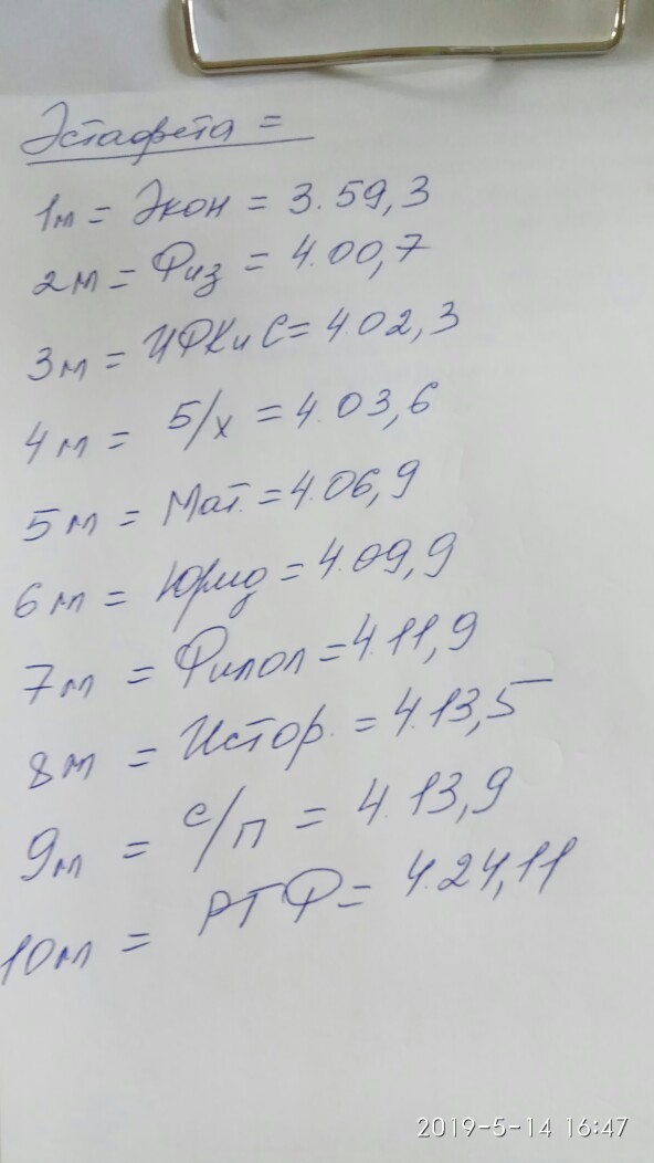 Победителем эстафеты стала команда экономического факультета: Севрикеев Денис, Куклев Никита, Скакун Елена, Фрицлер Мария, Макаров Илья, Амирханова Диана, Павлова Анастасия, Погосян Давид.