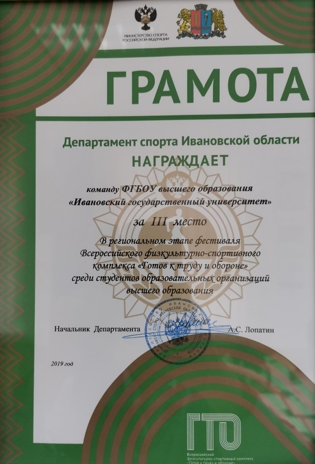16 октября 2019 года в зале Ивановского дома национальностей состоялось торжественное награждение победителей Спартакиады Ивановской области среди образовательных учреждений высшего образования 2018–2019 учебного года и победителей и призеров фестиваля Всероссийского физкультурно-спортивного комплекса «Готов к труду и обороне» среди студентов.