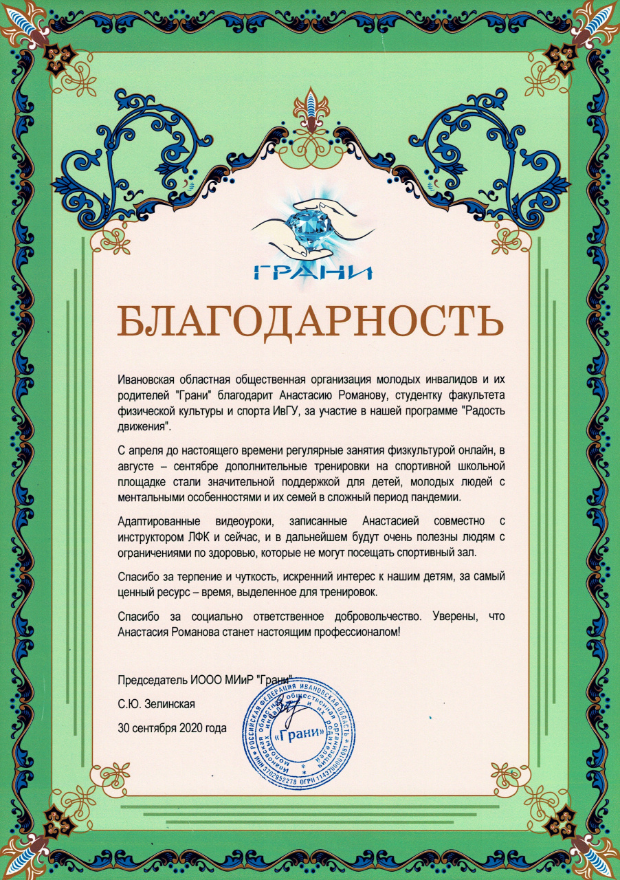 Ивановская организация молодых инвалидов «Грани» благодарит студентку ИвГУ Анастасию Романову (кафедра физической культуры и безопасности жизнедеятельности) за поддержку программы «Радость движения», за ответственное добровольчество.