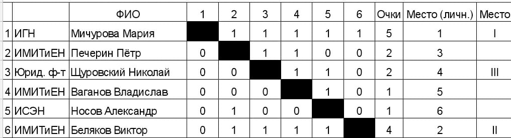 Желающих побороться за призовые места на Спартакиаде ИвГУ оказалось 19 человек. Через «сито» отборочных соревнований в финальную часть вышли 6 студентов, которые состязались друг с другом в финальном круговом турнире. Несколько кадров с самого турнира и призеры – на фотографиях. Поздравляем с победой студентку Института гуманитарных наук Мичурову Марию!