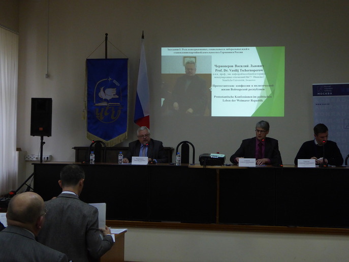 Заведующий кафедрой всеобщей истории и международных отношений В.Л. Черноперов выступил с докладом на международной научной конференции «Консервативные, социальные и либеральные тенденции в партийно-политическом развитии Германии и России: история и современность», которая при поддержке Представительства фонда Конрада Аденауэра (ФРГ) в РФ прошла в Череповецком государственном университете 10–12 октября 2016 г.