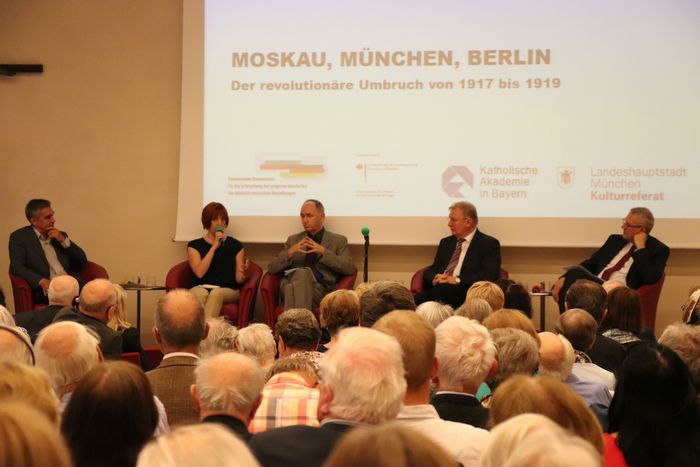 Научный коллоквиум открылся 5 июля подиумной дискуссией «Москва, Мюнхен, Берлин: революционный перелом 1918 – 1919 гг.», которая при поддержке Департамента культуры г. Мюнхена и Института современной истории (Мюнхен-Берлин) прошла в большом зале Баварской католической академии и собрала несколько сотен слушателей. Предметом обсуждения немецких и российских экспертов стали вопросы взаимных влияний конкурирующих политических моделей 1918 – 1919 гг., сложившихся в России и Германии (Берлине и Мюнхене). Высокий научный уровень, заданный на подиумном заседании, подхватили докладчики, выступавшие на следующий день, 6 июля, уже в конференц-зале одного из самый авторитетных исследовательских центров ФРГ – Институте современной истории.