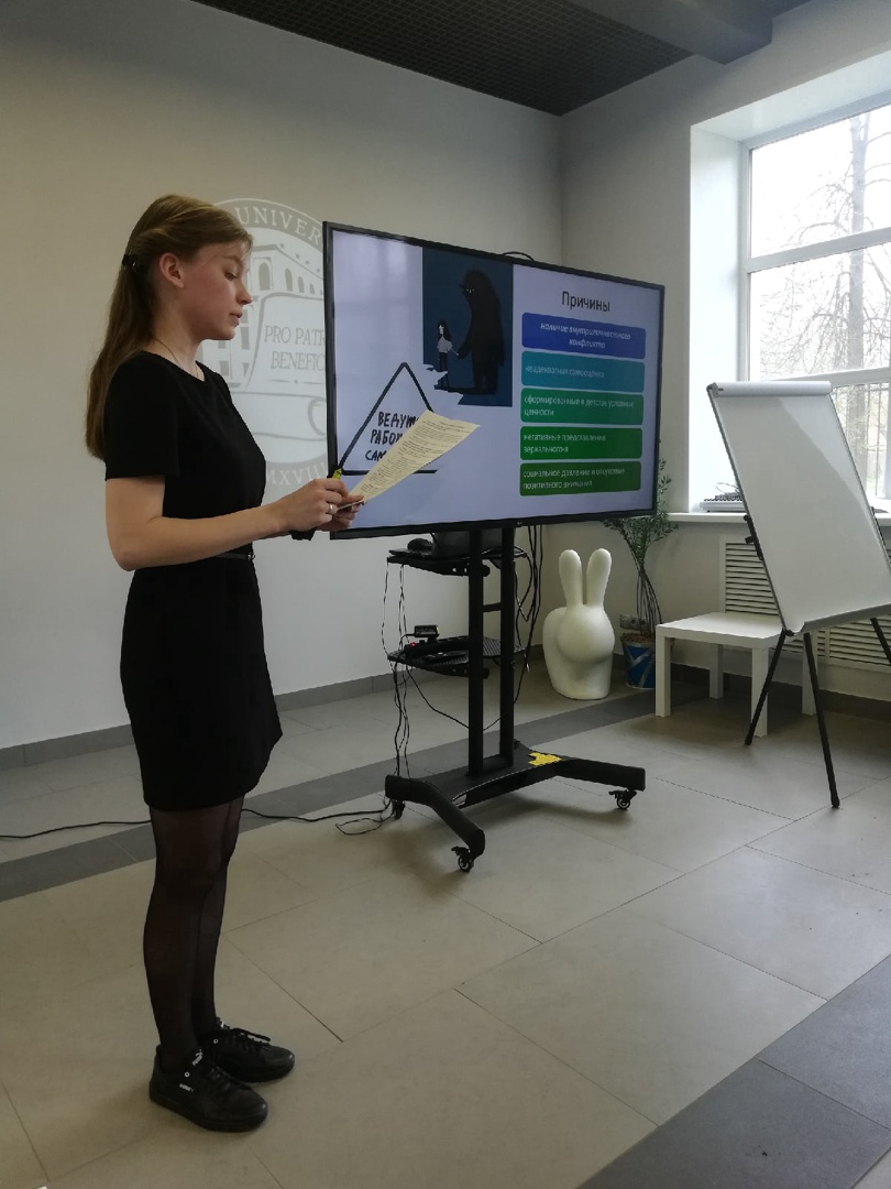 Затем выступили студенты 2-го курса направления подготовки «Психология». Они рассмотрели тему молодежного выгорания как актуальную проблему современного общества и раскрыли ее с точки зрения трех основных психологических направлений, таких как бихевиоризм, психоанализ и гуманистическая психология. Мероприятие завершилось обсуждением темы «Три силы в психологии. Что сильнее в современных реалиях?». В дискуссии приняли участие не только студенты разных курсов и направлений, но и преподаватели, а также гости мероприятия.