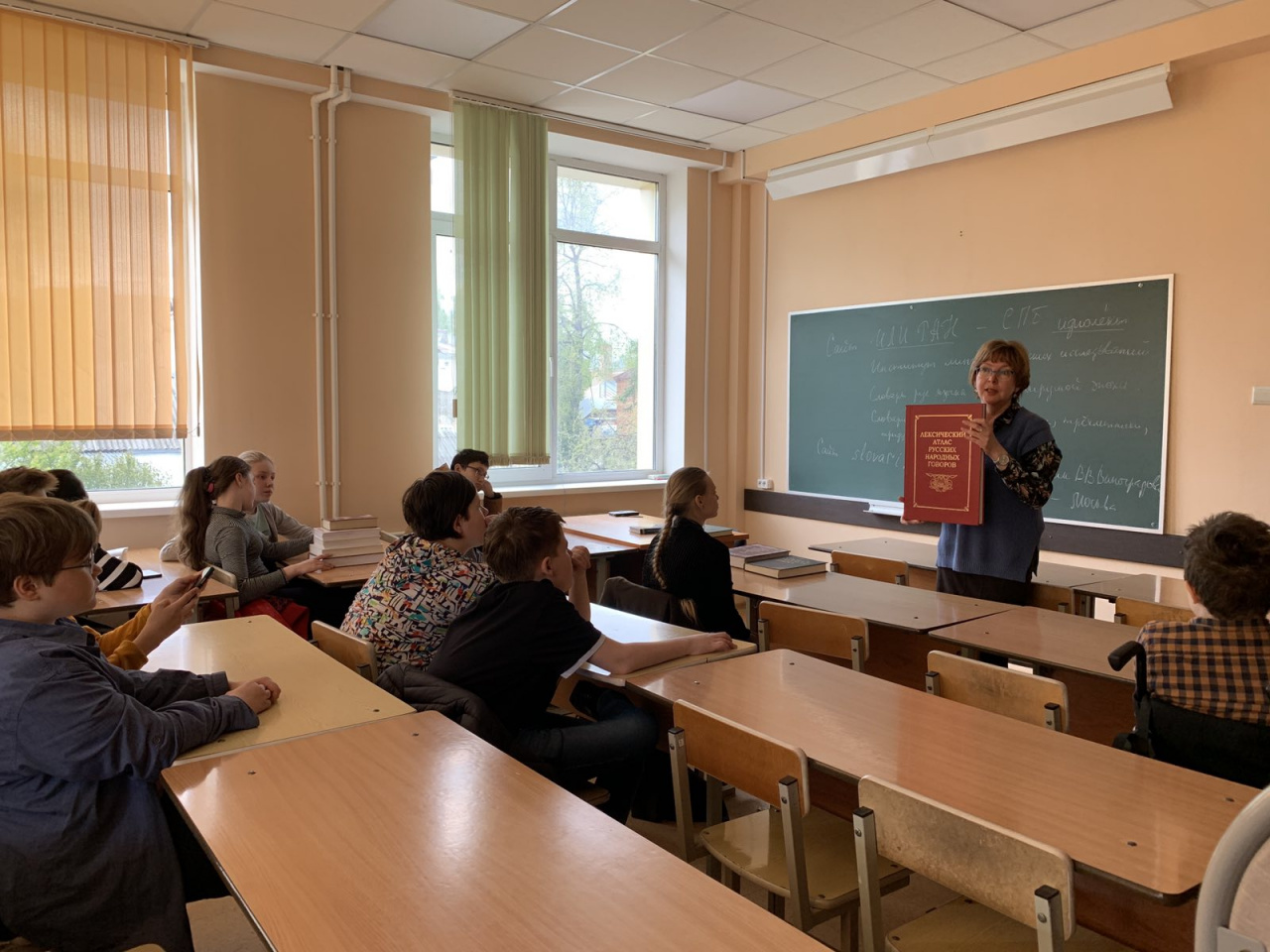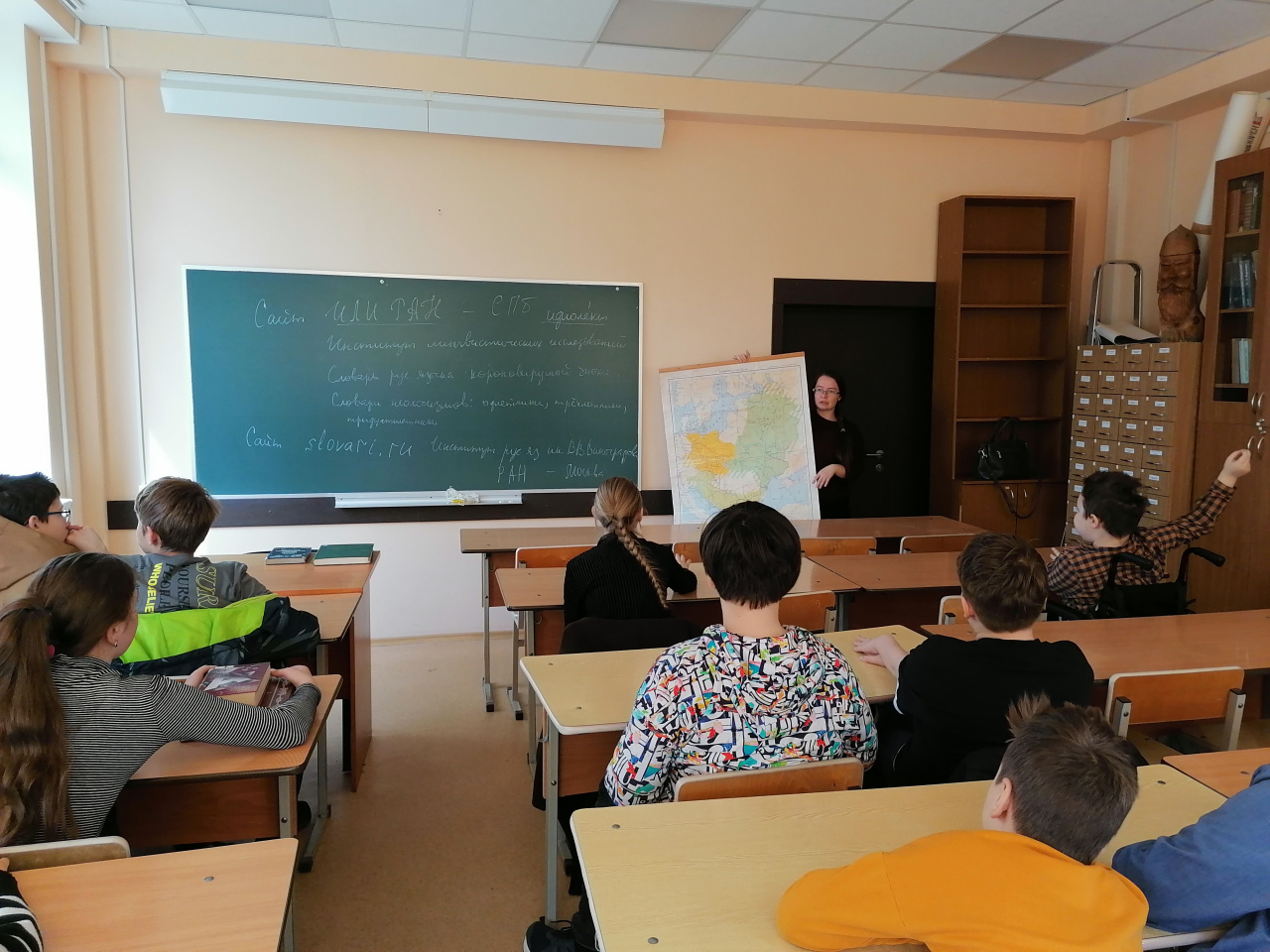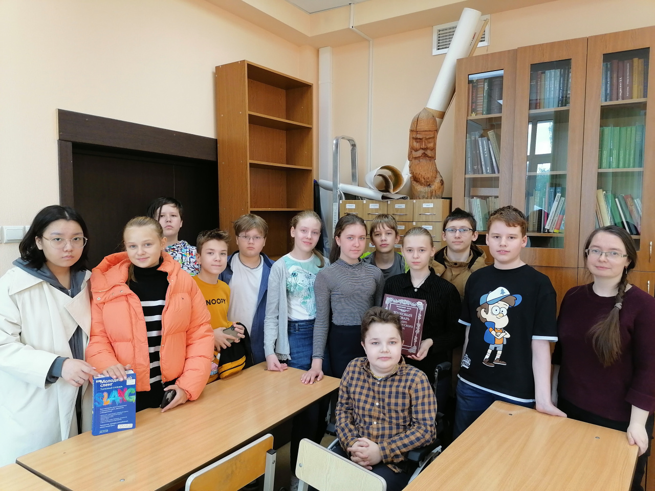 В День филолога учащиеся 6-го класса ЧОУ «Исток» в сопровождении учителя русского языка, аспиранта кафедры отечественной филологии Дарьи Сергеевны Квашниной прибыли в кабинет русского языка для знакомства с лексикографическими богатствами кафедры – лингвистическими словарями, лексическим атласом русских народных говоров и диалектологической картотекой.