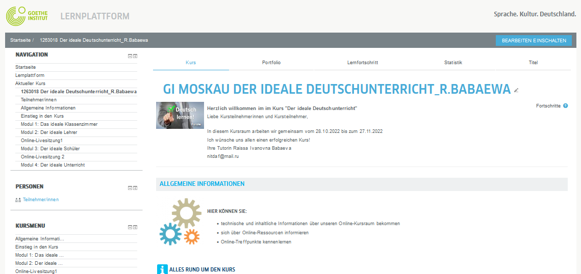 Онлайн-курс включал в себя выполнение разнообразных заданий на платформе moodle и две онлайн-конференции в программе Zoom. Обучение проходило на немецком языке. Это способствовало тому, что участники курса имели возможность применить свои знания немецкого языка на практике и усовершенствовать разговорные навыки. Но не менее значимым результатом участия в этом мероприятии являются полученные знания в области методики преподавания иностранного языка. Основной акцент при обсуждении материалов курса делался на методических принципах и необходимых предпосылках, обеспечивающих высокое качество урока иностранного языка. Приобретенный опыт участия в подобном мероприятия является особенно ценным, потому что обучение, приобретение новых знаний проходило не только при обработке предложенных материалов, но и во время многочисленных дискуссий, где участники делились собственным опытом и обменивались имеющимися методическими приемами и видами креативных заданий. Обмен опытом и знаниями проходили на высоком уровне, потому что в курсе участвовали опытные преподаватели, представлявшие вузы и школы города Иваново, а также начинающие преподаватели в лице магистрантов (многие из них уже имеют небольшой опыт преподавания иностранных языков в различных учебных заведениях). Данная форма обучения является эффективной, так как знания и навыки, необходимые для преподавательской работы, приобретаются в ходе активной деятельности.