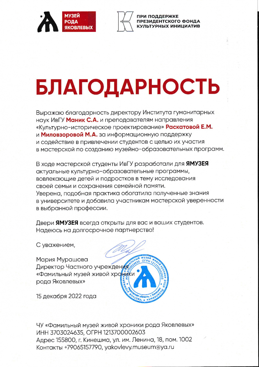 В течение осени-зимы 2022–2023 уч. года на базе музея рода Яковлевых «ЯМузей» (г. Кинешма) была организована Мастерская по разработке культурно-образовательных программ, цель которой – вовлечь детей и подростков в темы исследования истории своего рода и сохранения семейной памяти.