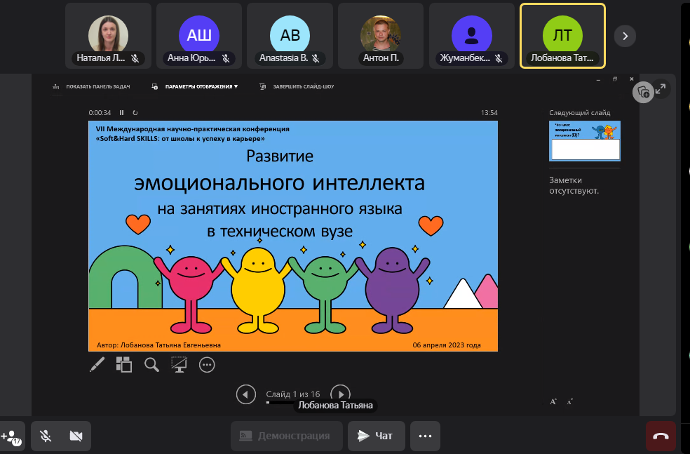 ИвГУ представили доцент кафедры иностранных языков Лаврентьева Наталья Геннадьевна и аспирант кафедры непрерывного психолого-педагогического образования Лобанова Татьяна Евгеньевна (научный руководитель – доктор педагогических наук, доцент Прохорова Анна Александровна). Н.Г. Лаврентьева выступила с совместным докладом с к. ф. н., доцентом кафедры интенсивного изучения английского языка ИГЭУ Е.В. Орловой на тему «Использование сторителлинга для развития дизайн-мышления в обучении иностранному языку в вузе». Т.Е. Лобанова представила доклад на тему «Развитие эмоционального интеллекта на занятиях по иностранному языку в техническом вузе».
