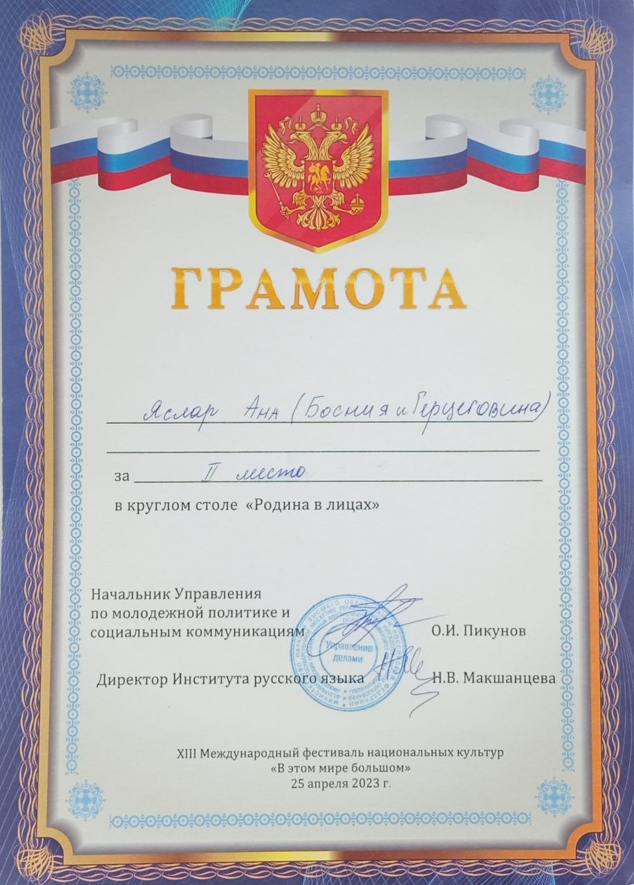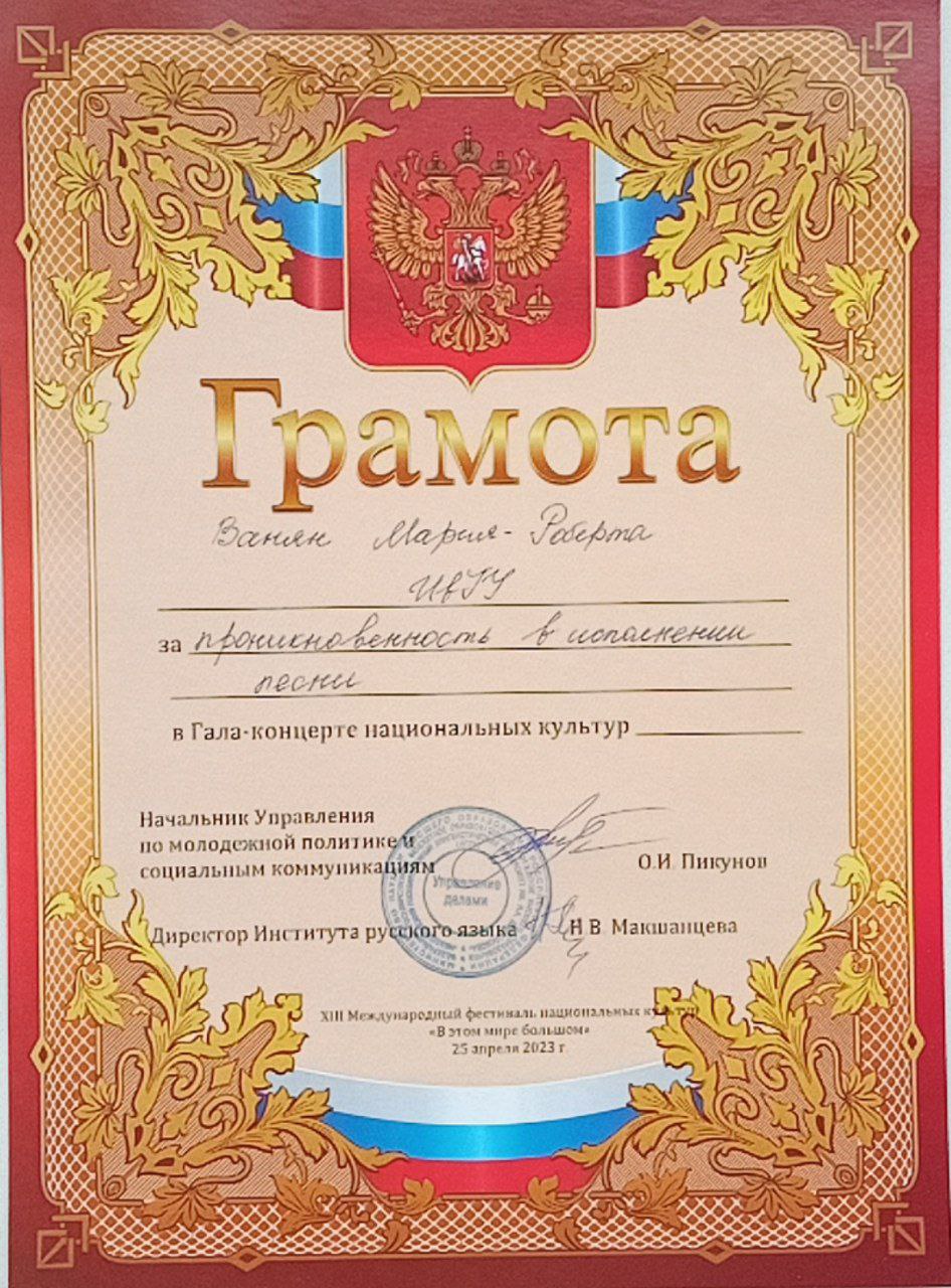 Яслар Ана, студентка 4-го курса бакалавриата направленности «Отечественная филология», выступила на круглом столе «Родина в лицах» и заняла II место. Ванян Мария-Роберта, студентка 1-го курса направленности «Зарубежная филология», выступила на круглом столе «Культурные традиции моей страны» и награждена грамотой за «проникновенность в исполнении песни» на Гала-концерте национальных культур.