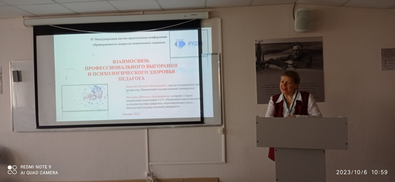 5–7 октября 2023 года в Российском университете дружбы народов им. Патриса Лумумбы проходила 4-я международная научно-практическая конференция «Приверженность вопросам психического здоровья». Формат конференции включал пленарные и секционные заседания, конкурс стендовых докладов студентов, интерактивный киносеанс фестиваля «Mental Health Festival» (кино о ментальных проблемах), брейн-ринг студентов-психологов, II Международный Арт-фестиваль «PSY ART», круглый стол, курсы дополнительного образования. Ивановский государственный университет представляли студенты, преподаватели и аспирант Института гуманитарных наук. В программе конференции было заявлено более 100 научных докладов российских и зарубежных специалистов. Тематика докладов соответствовала девизу конференции: «Здоровье. Психология. Компетентность: фокусы современного человека».