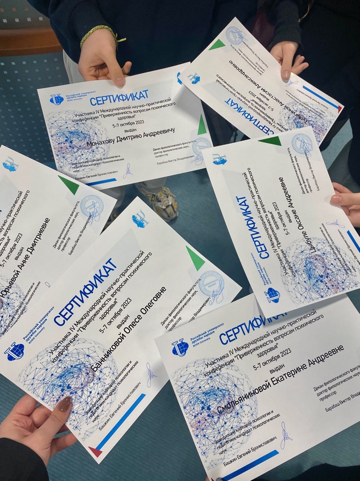 Студенты также активно участвовали во всех мероприятиях конференции и получили сертификаты участников. Научно-практическая конференция стала отличной возможностью для студентов погрузиться в международную научную психологическую среду, послушать доклады ведущих психологов и молодых учёных, посвящённых многогранной проблеме психического здоровья, пополнить свой багаж знаний.