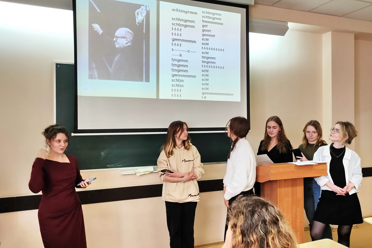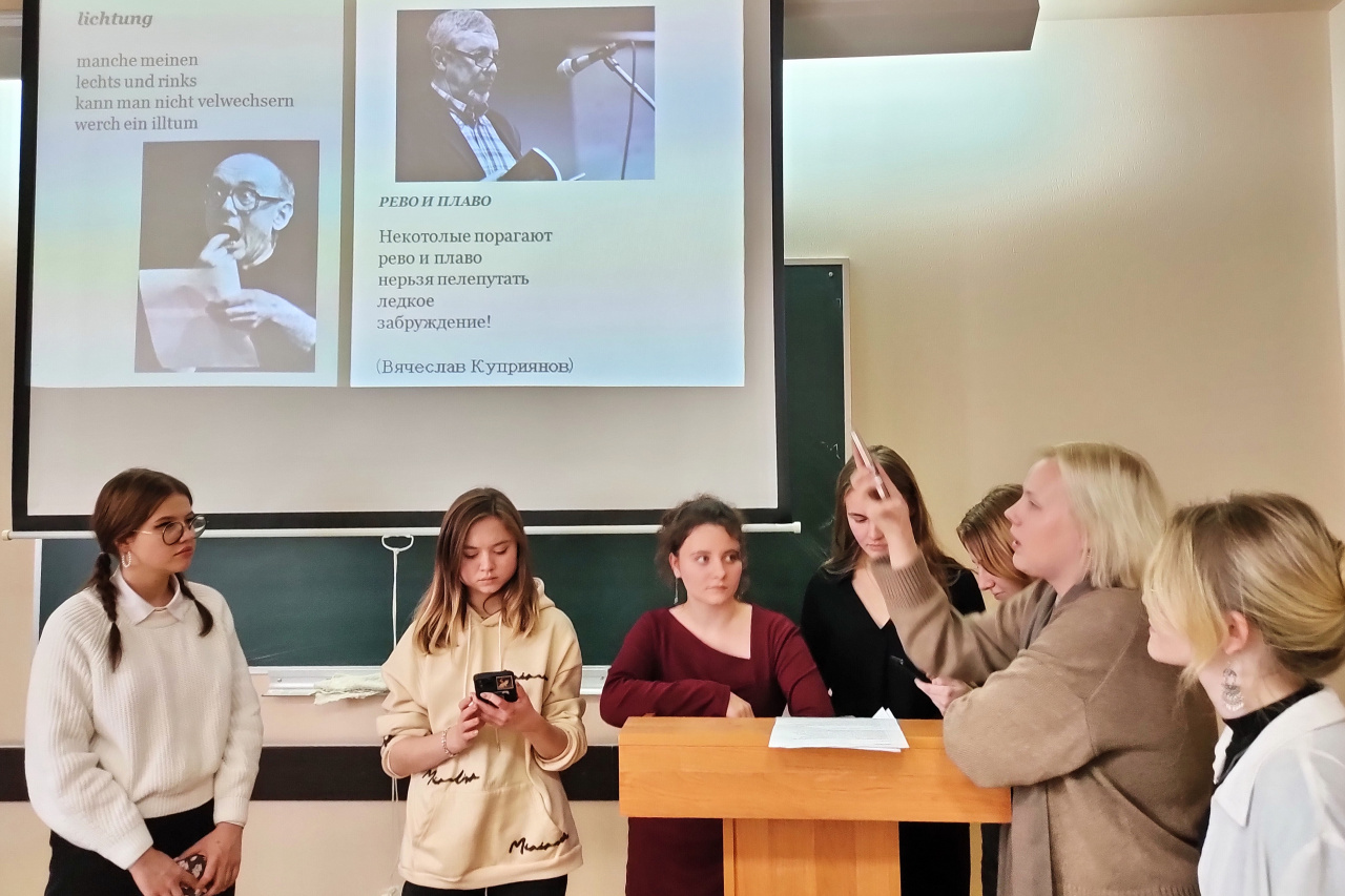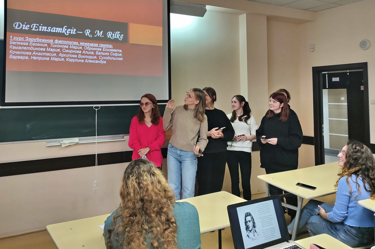 18 октября 2023 г. в Институте гуманитарных наук прошло мероприятие, приуроченное ко Дню переводчика. Студенты 1–3-х курсов образовательной программы «Зарубежная филология» / «Иностранные языки и литература, переводоведение» выступили с презентациями на тему переводов поэзии немецкоязычных авторов и обсудили трудности работы с текстами такого вида.