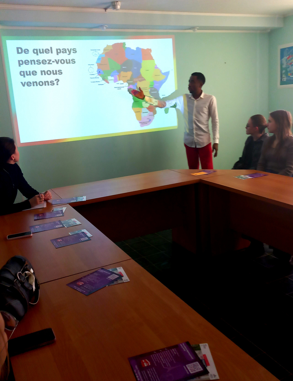 Директор центра Е.А. Гудкова рассказала о деятельности Всемирной организации франкофонии, о статусе французского языка в мире. Студентки ИвГУ получили возможность познакомиться не только с уроженцами Кот-д’Ивуара Ариэль Кристой и Седриком Ахуи и уроженцем Камеруна Клодом Нгепнангом, но и с разнообразными фактами из жизни их стран, языковым многообразием и обычаями. Доступный язык презентаций и форма квиза не оставили равнодушным никого из присутствующих. «Всё было очень понятно, несмотря на то, что у нас начинающий уровень изучения языка, что меня даже удивило. Очень интересно было послушать французскую речь носителей и понаблюдать за тем, как они произносят те или иные слова. Атмосфера была замечательная, дружественная, впечатления только позитивные» (А. Егорова). В свою очередь девушки подготовили подарок для хозяев встречи – они исполнили две песни на французском языке: французскую народную «Sur le Pont d’Avignon» и популярную «La Seine» под гитару. Зрители пели вместе с нашими студентками, а затем слушали и дополняли слова гимна Франкофонии.