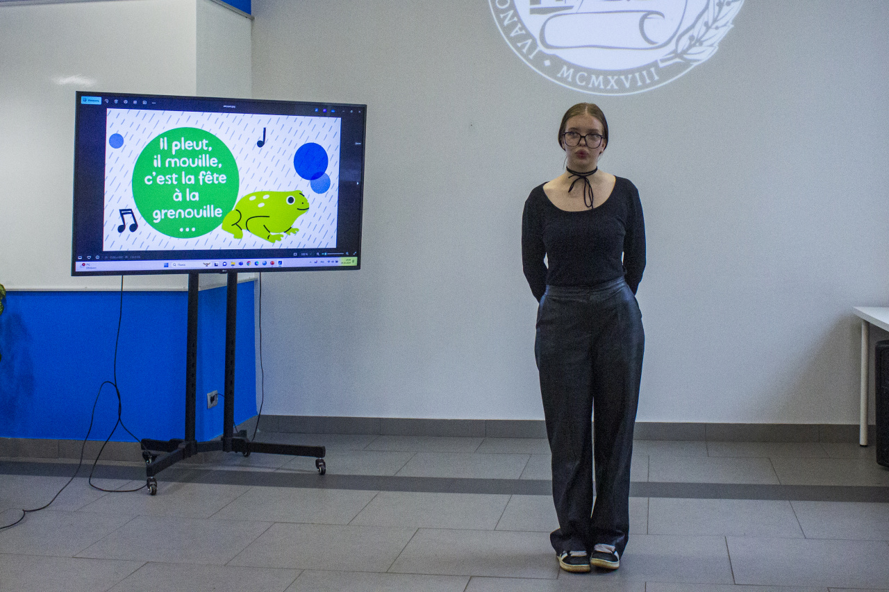 Начало учебного года – первая осенняя веха, и собравшиеся приветствовали её гимном студенчества Gaudeamus igitur при поддержке студентов 1-го курса 2-й английской группы. Лето растаяло, как шоколадное мороженое, мы попрощались с ним песней «Gelato al cioccolato» в исполнении 2-й английской группы 2-го курса. Эти хрупкие девушки стали настоящими атлантами нашей встречи, исполнив четыре песни на французском и два стихотворения на французском и итальянском языках!